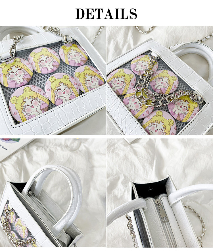 前の透明カバーに飾り板が入っていて、自分の好きな小物を入れることができるバッグです。 好きな芸能人や、アニメの写真 、缶バッジ、ストラップ、キーホルダーなどを入れるだけで、簡単に世界で1つたったのオリジナルバッグの完成です、毎日楽しく使える。
