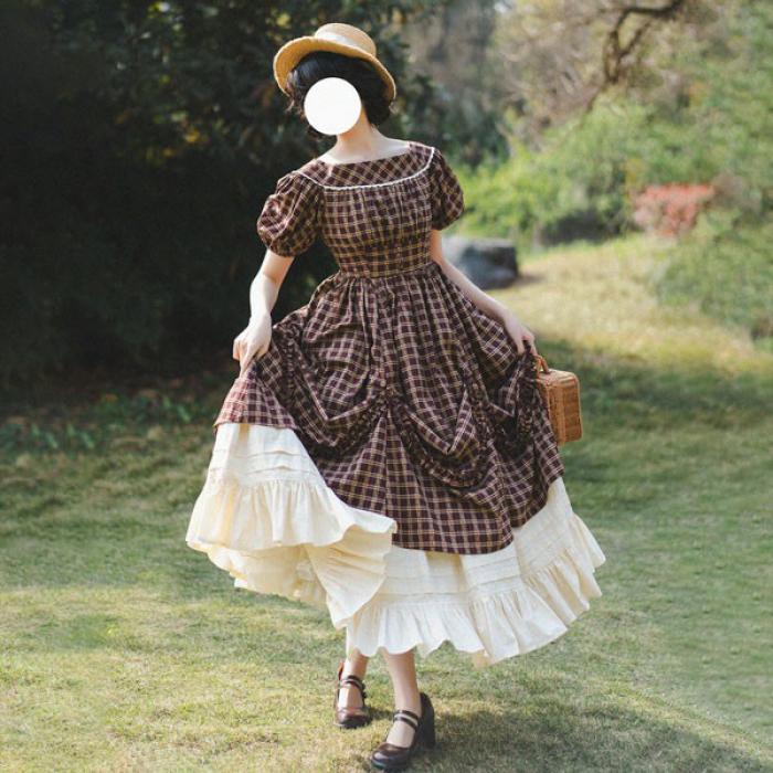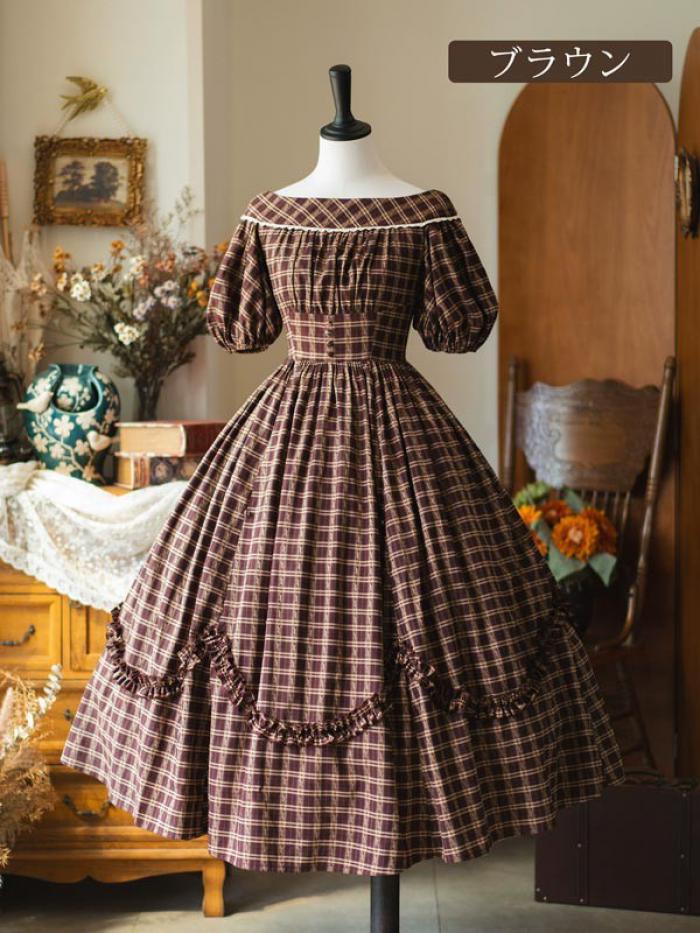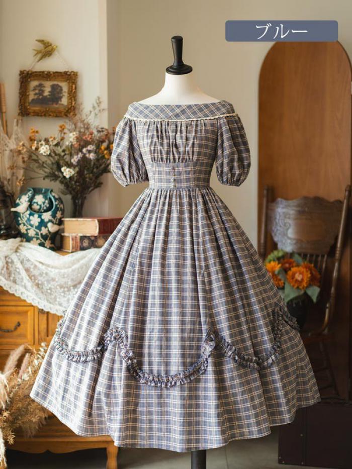 ロリータ ワンピース 2WAY オフショルダー チェック柄 春夏用 着丈調整可 ペチスカート追加可 半袖 レディース フレアスカート リゾートワンピ 日常着 お出かけ 旅行 衣装 大人 仮装 コスプレ