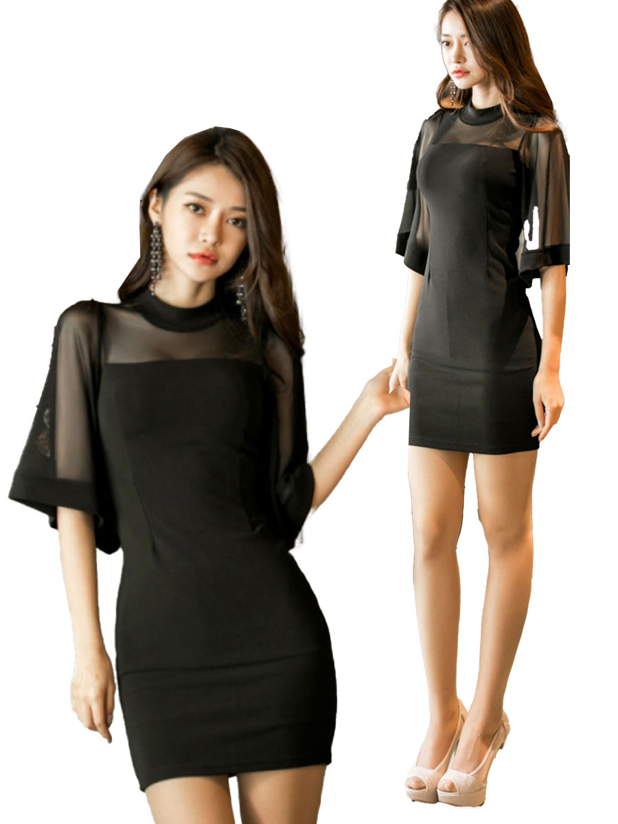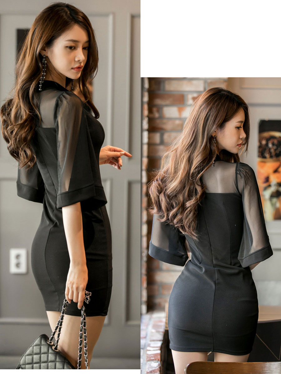キャバ 魅惑 ドレス レディース 黒 パブ 長袖 レース タイト スカート エレガント プリーツ 韓国 セクシー