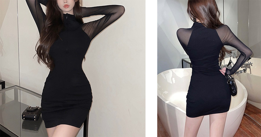 エレガントでセクシーな魅力を引き出す、袖がシースルー素材のシアー長袖ワンピース。