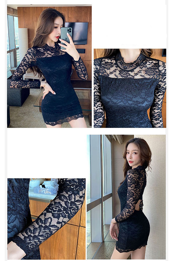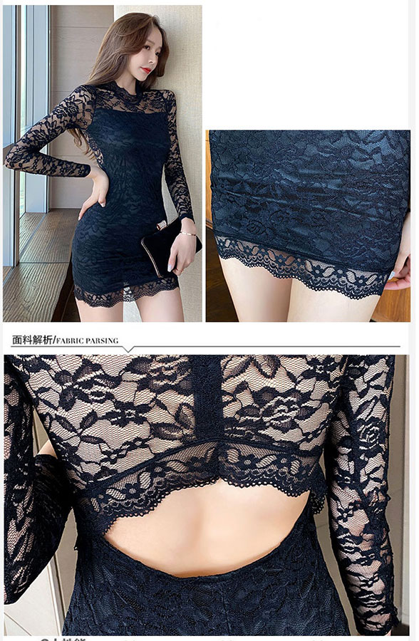 キャバ 魅惑 ドレス レディース 黒 パブ 長袖 レース タイト スカート エレガント プリーツ 韓国 セクシー