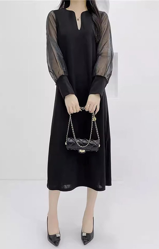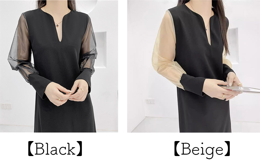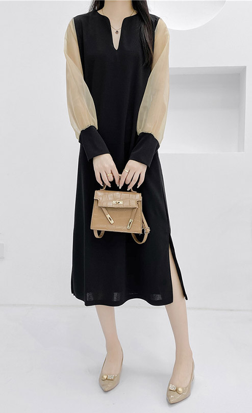 こちらの上品でセクシーなロングワンピースは、シースルーの袖が特徴的なデザインです。