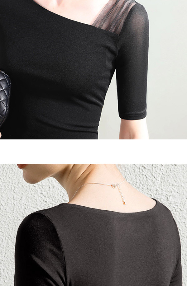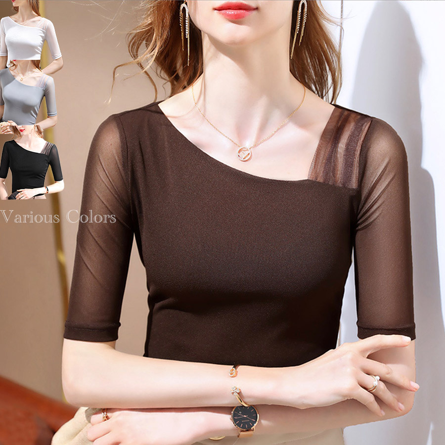 五分袖 アシンメトリー チュール シースルートップス フォーマル ブラウス シアーシャツ ストレッチ