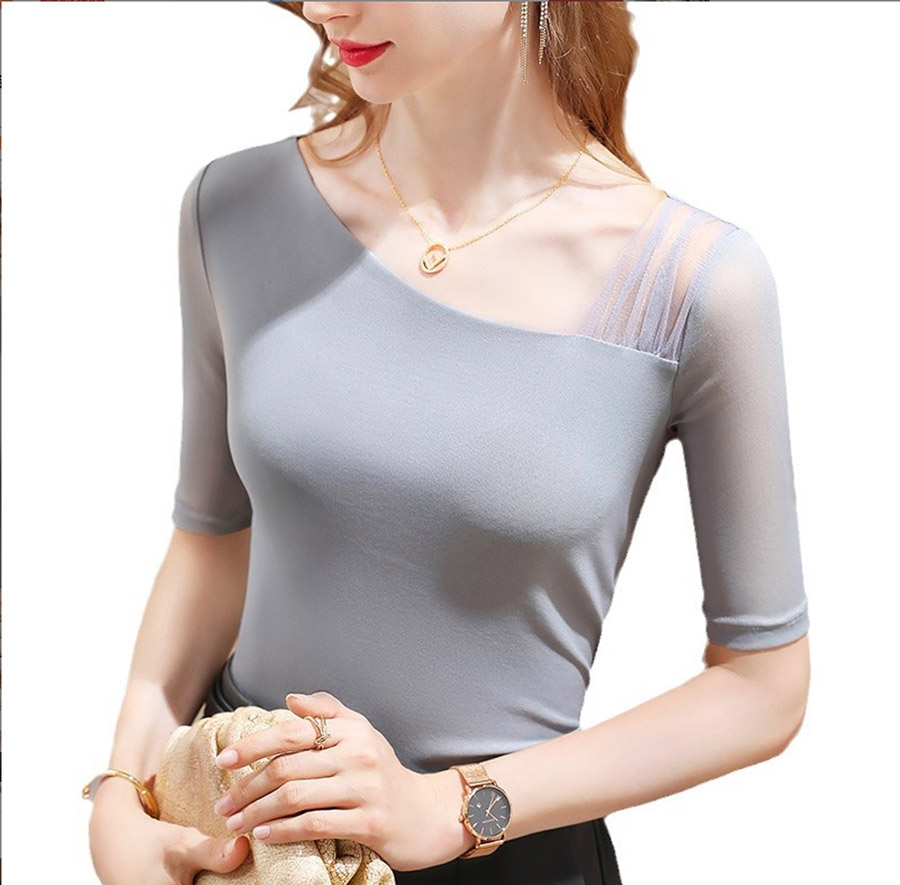 ┣ レディース レースデザイン 半袖 五分袖 シアートップス カットソー アシンメトリーデザイン┫