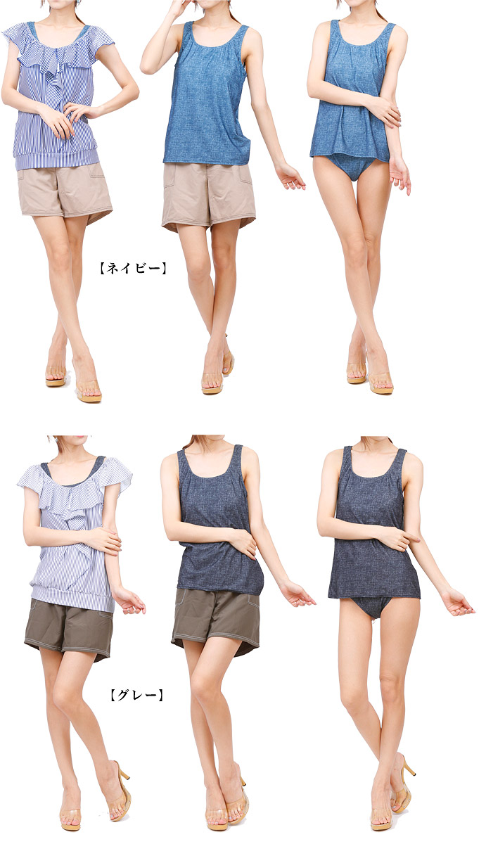 水着 レディース 体型カバー 大きいサ 水着 新作 グレー(カーキパンツ) ネイビー(茶パンツ) 15号 17号 19号