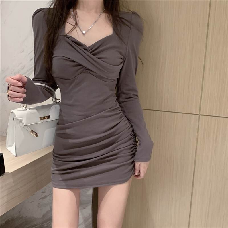2色 ワンピース ミニ ドレス キャバドレス タイト 大人可愛い セクシー レディース 長袖 露出 肌見せ グレー 灰色 ブラック 黒 大人カラー パーティードレス 超ミニ 袖あり キャバ ギャ 無地