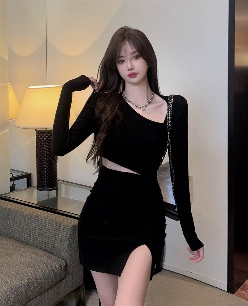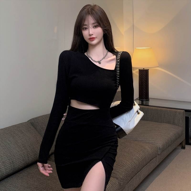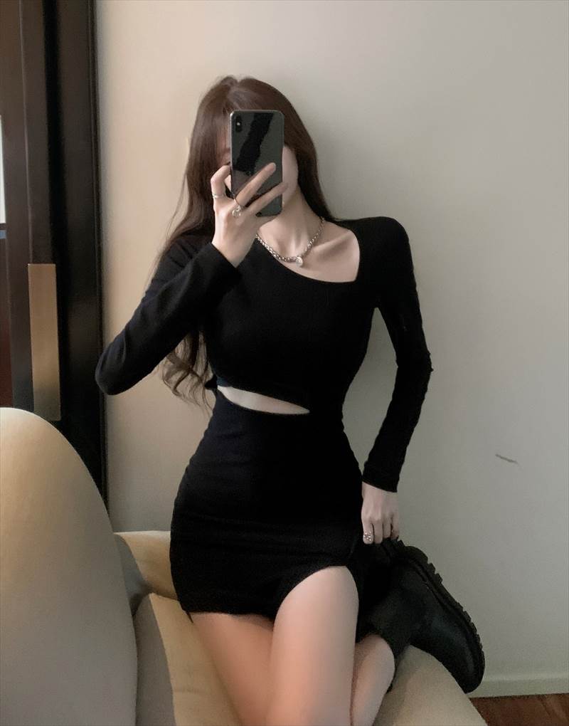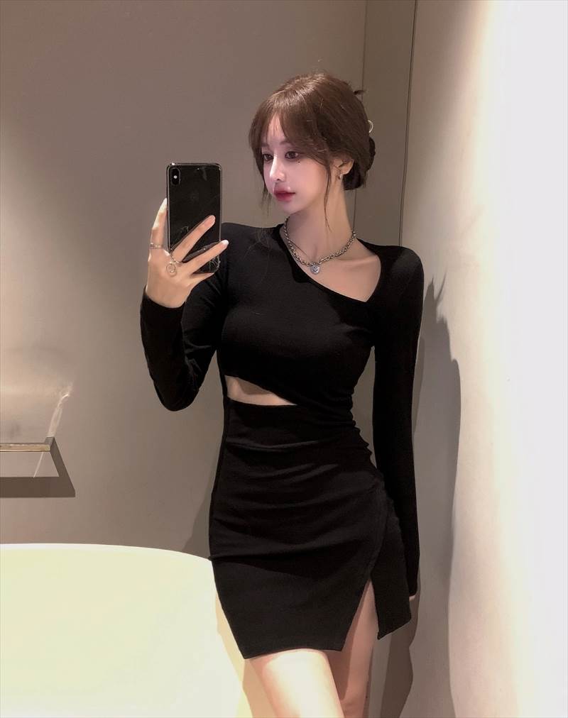ワンピースドレス 黒 無地 ミニ セクシー キャバドレス タイト レディース 長袖 袖あり ミニ丈 スリット ウエストスリット 肌見せ シック ブラック キャバ ギャル モノクロ