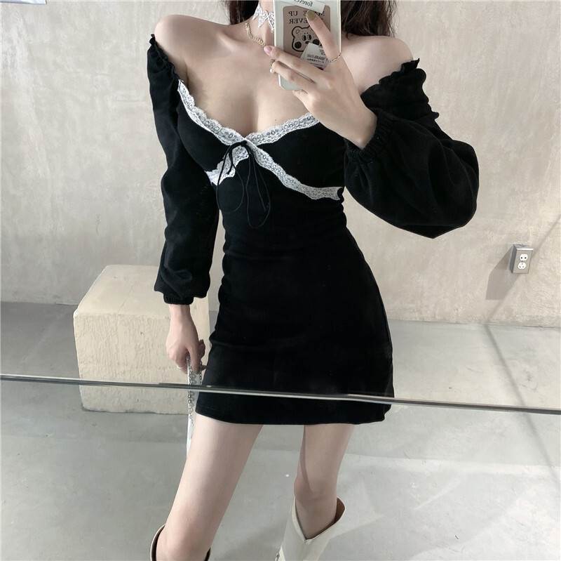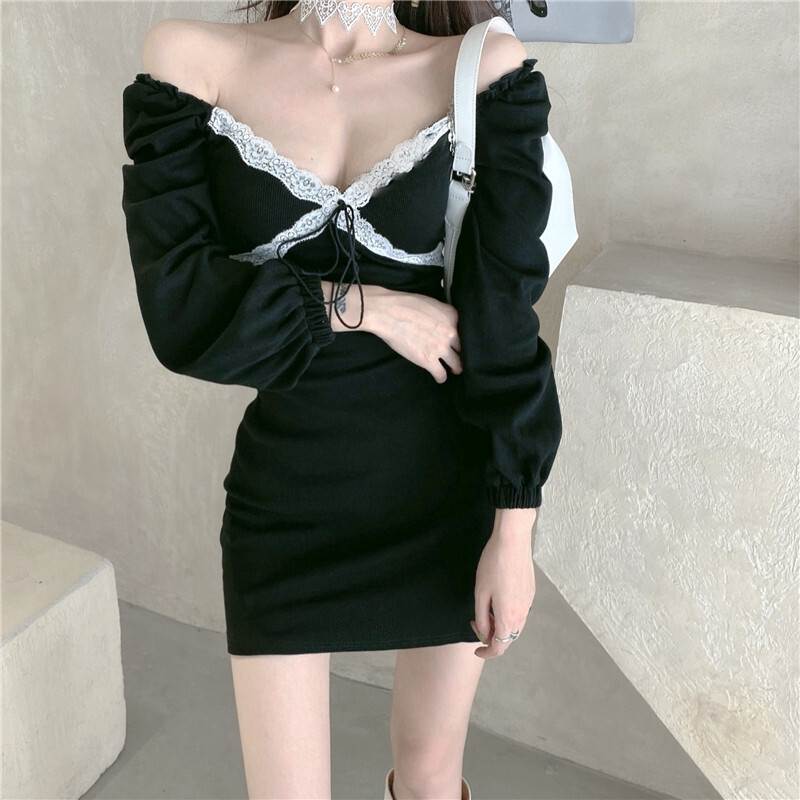 ワンピ ドレス キャバドレス レディース 長袖 オフショル オフショルダー 2WAY フリル レース リボン セクシー ミニ丈 キャバ 夜 小悪魔 甘辛 肌見せ ガーリー 細見せ かわいい キュート
