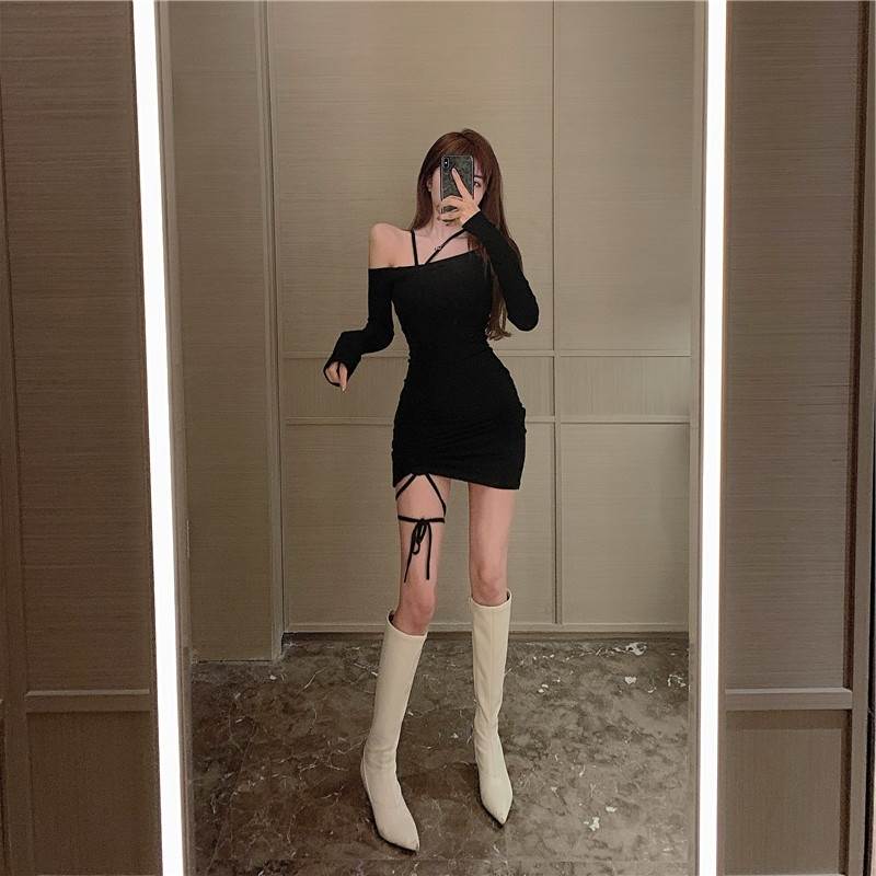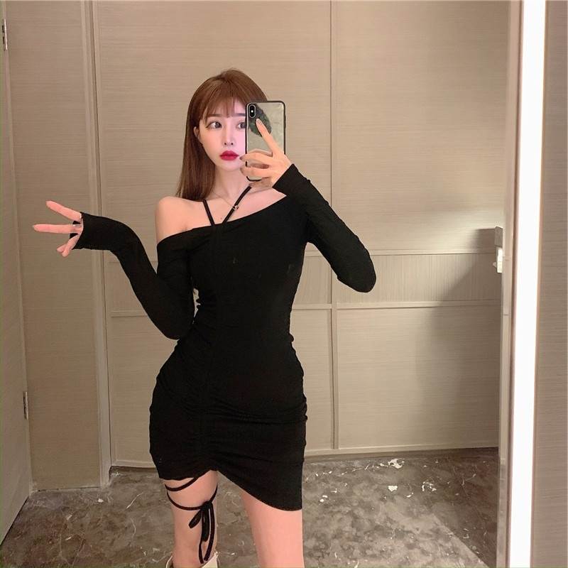 2色 ワンピース ドレス ミニ タイト キャバドレス セクシー アシンメトリー レディース ワンショルダー オフショルダー 個性的 肩出し リボン ブラック 黒 茶色 カーキ タイ ブラウン