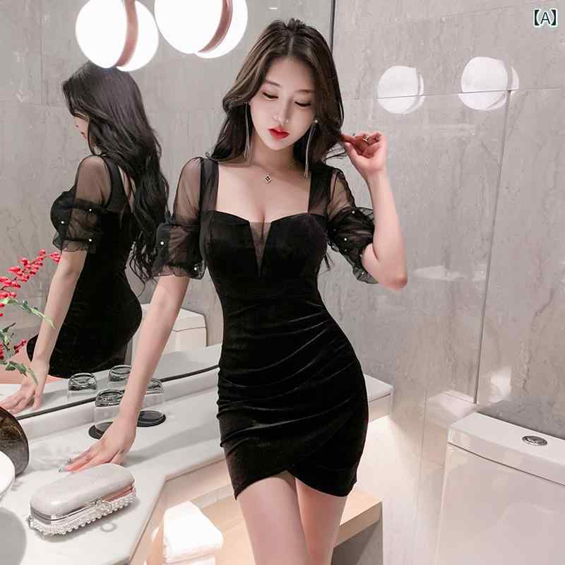 キャバ 魅惑 ドレス レディース 黒 パブ 長袖 レース タイト スカート エレガント プリーツ 韓国 セクシー