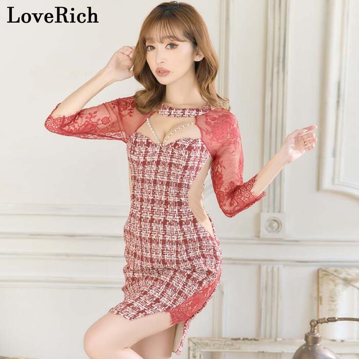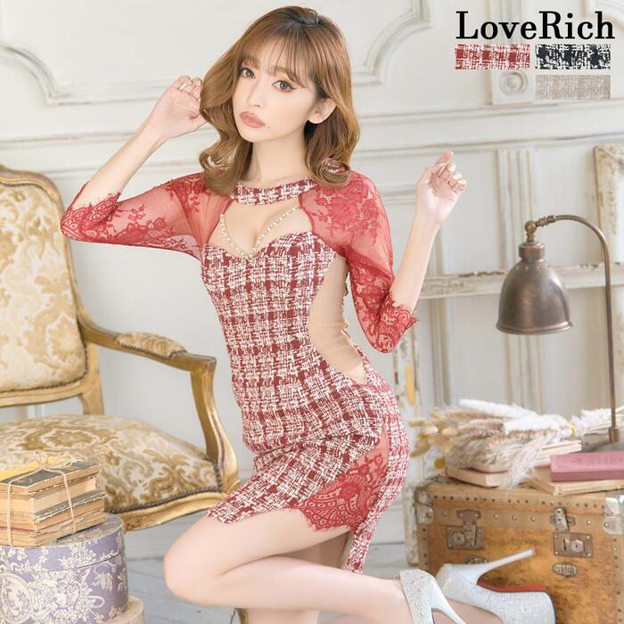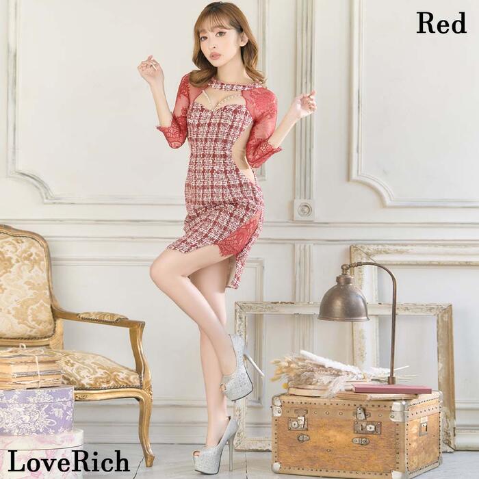 ★大人気!大胆セクシーなツイード素材のワンピース!透けレースの袖付きに豪華ビジュー使いがおしゃれ、バストはセクシーにカットされレーススリット入りタイトミニドレスです♪
