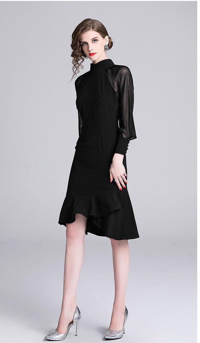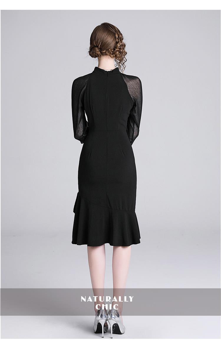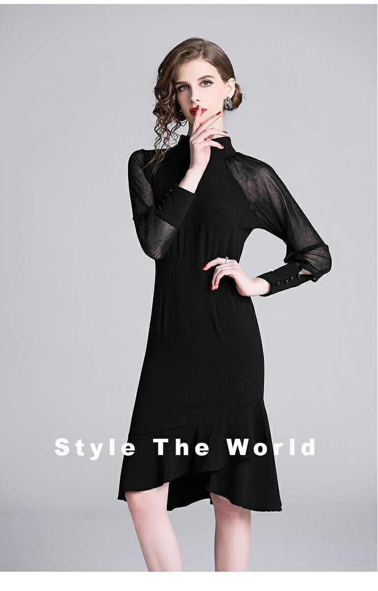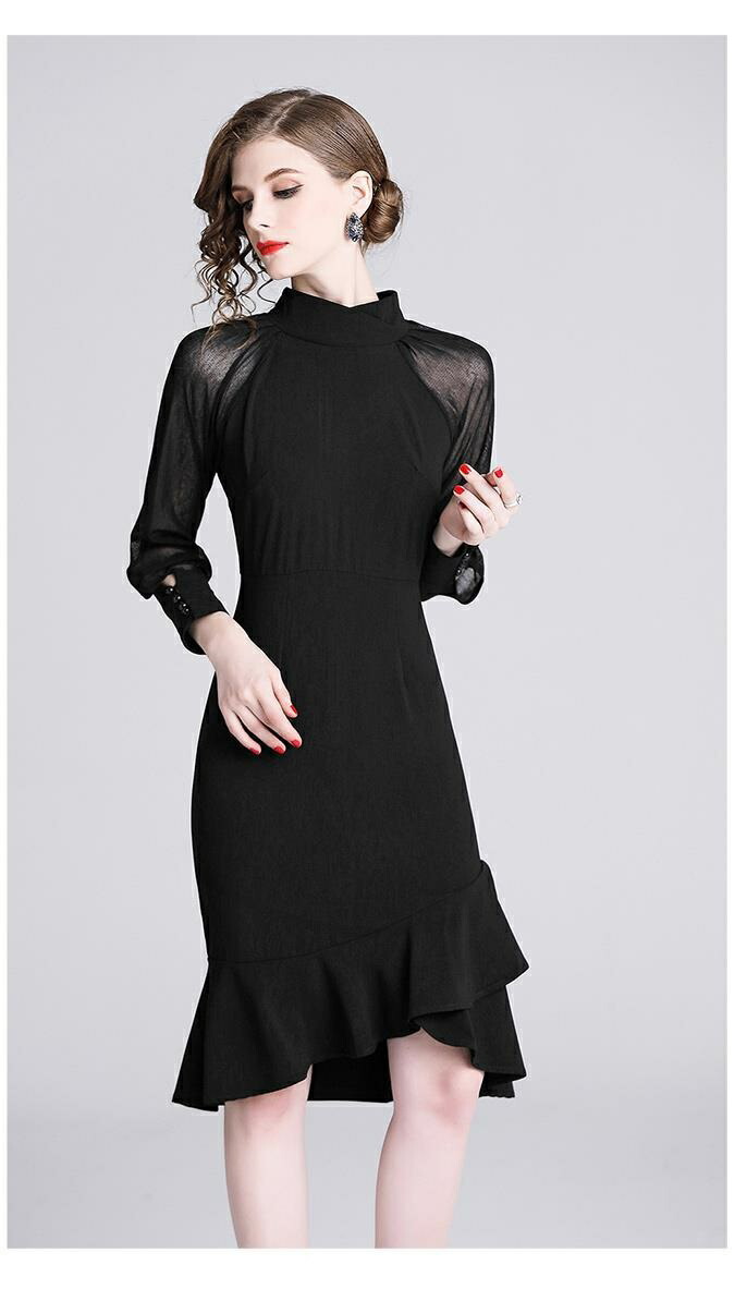 ★当店大人気!クラシカル系上品感漂うオシャレ着 ペプラムマーメイド お袖シフォン 異素材切替 長袖 ドレスワンピースです♪