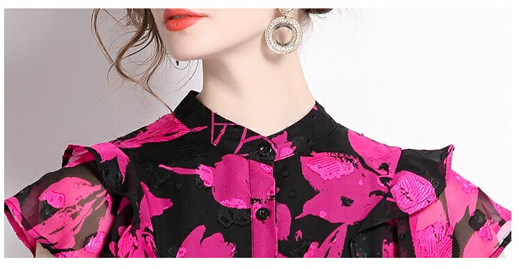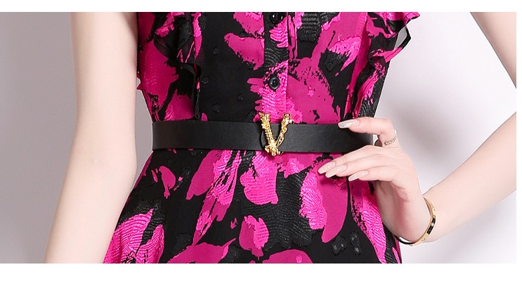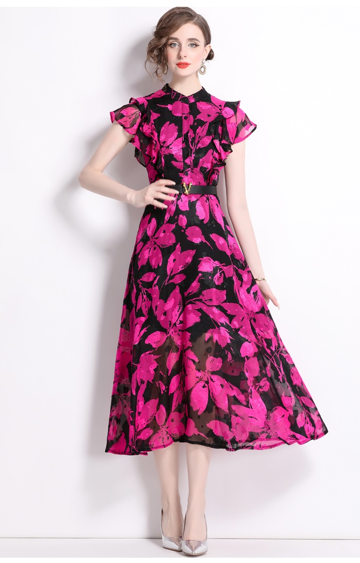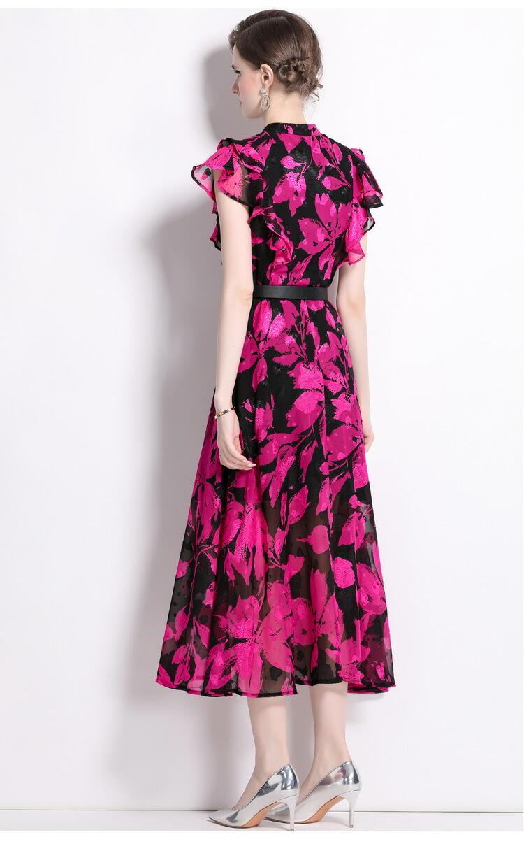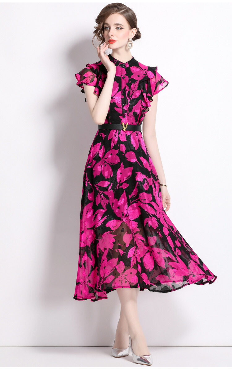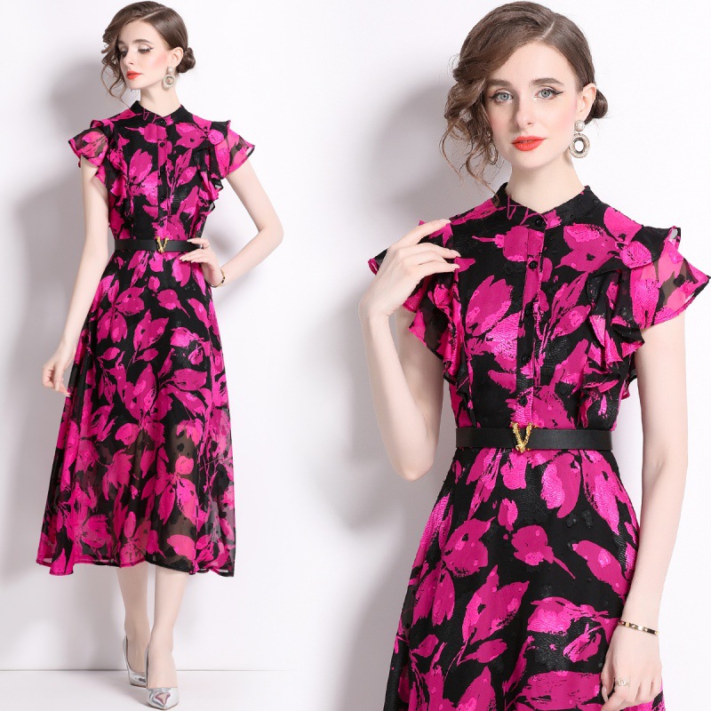 ★大人上品感!おしゃれクラシカル系優雅な印象を演出する優しい印象のベルト付きに可愛いフリル袖花柄プリントのロングドレスワンピースです♪