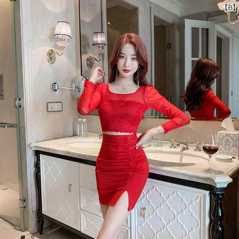 キャバ 魅惑 ドレス レディース 黒 パブ 長袖 レース タイト スカート エレガント プリーツ 韓国 セクシー