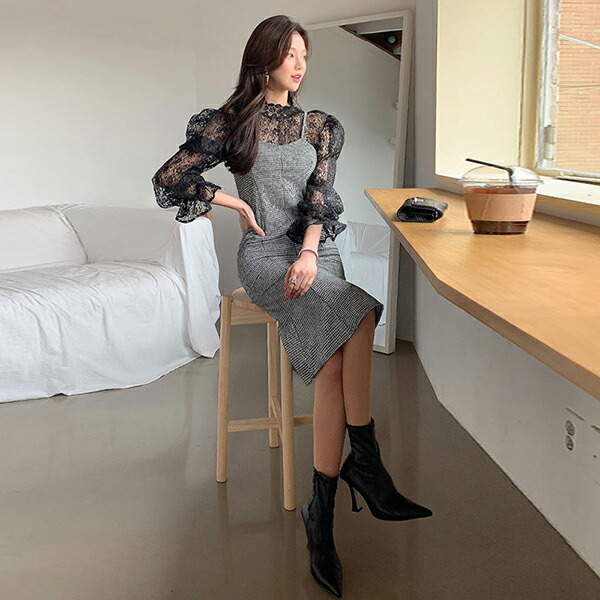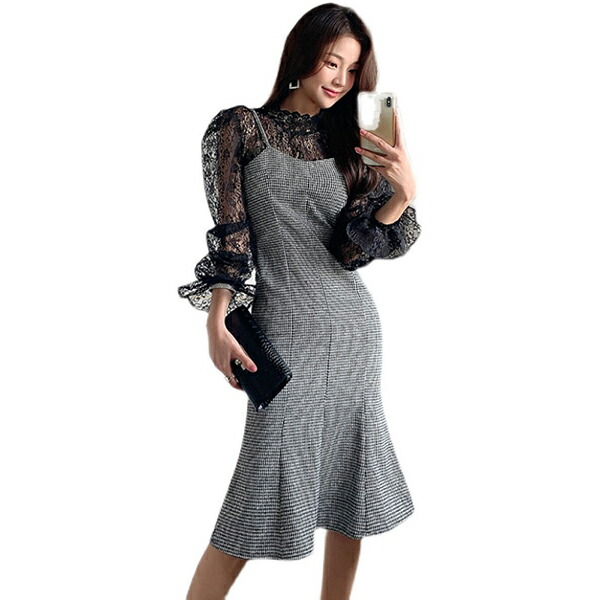 キャバ 魅惑 ドレス レディース 黒 パブ 長袖 レース タイト スカート エレガント プリーツ 韓国 セクシー