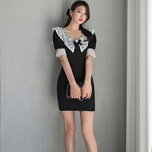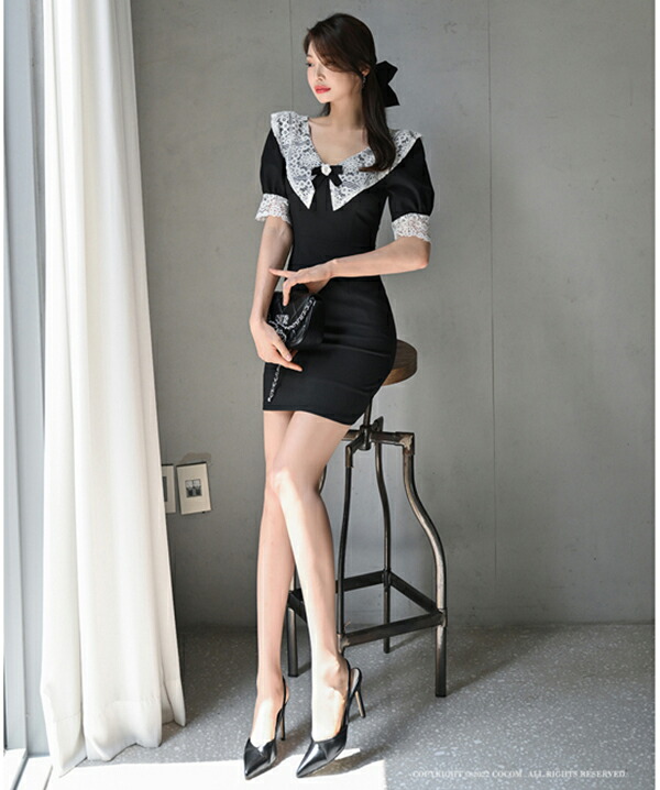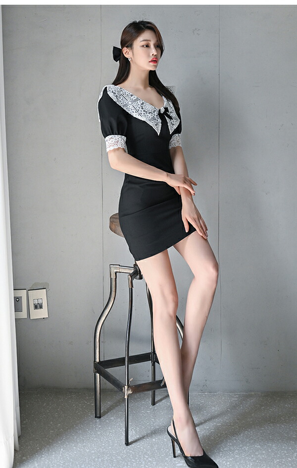 キャバ 魅惑 ドレス レディース 黒 パブ 長袖 レース タイト スカート エレガント プリーツ 韓国 セクシー