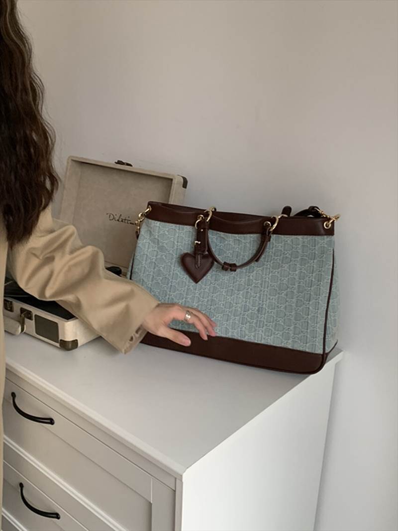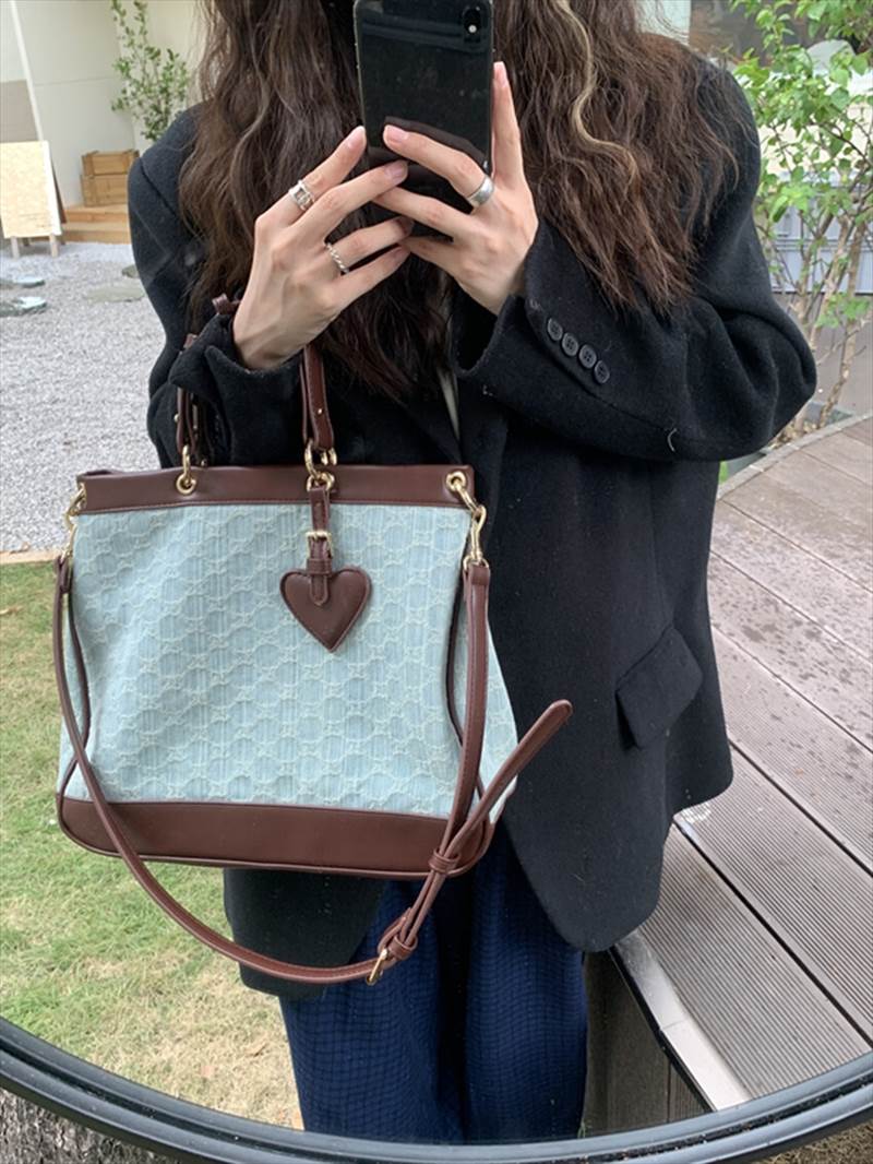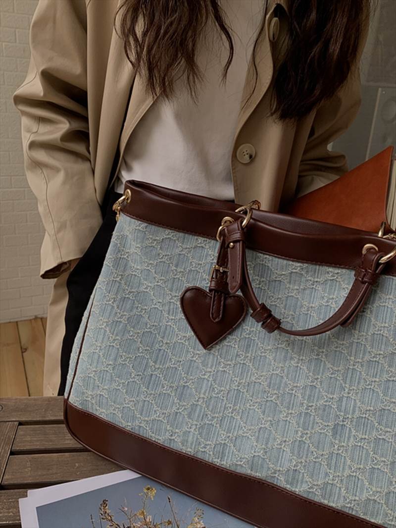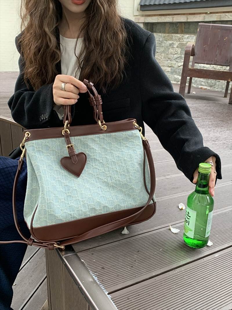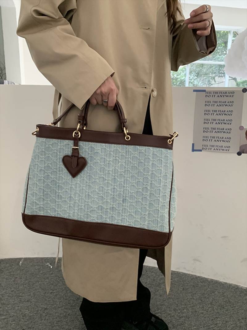 トートバッグ ショルダーバッグ ハート 刺繍 デニム 切り替え 肩掛け 大容量 大きめ PU レザー 革 手提げ 斜めがけ バック カバン 鞄 高見え 通勤 ビジネス 横長 旅行 レトロ バイカ A4