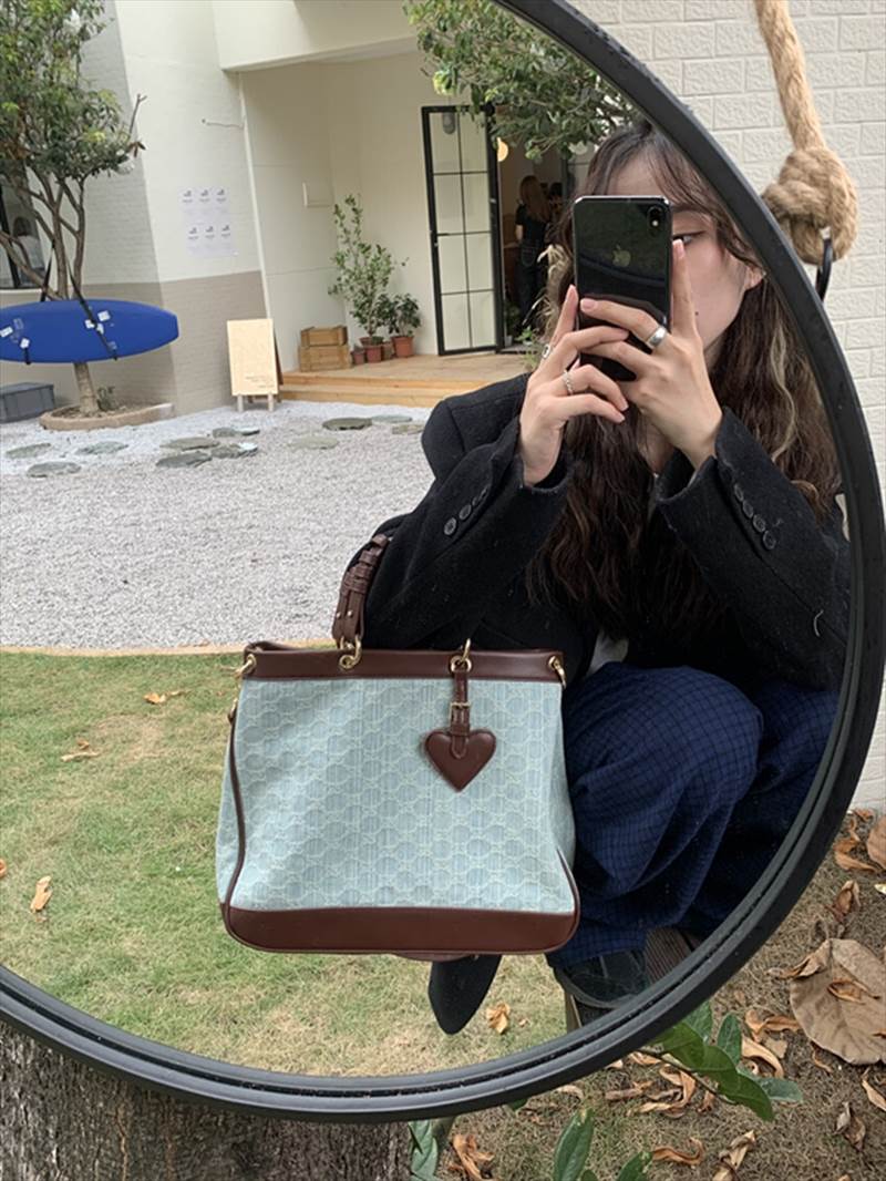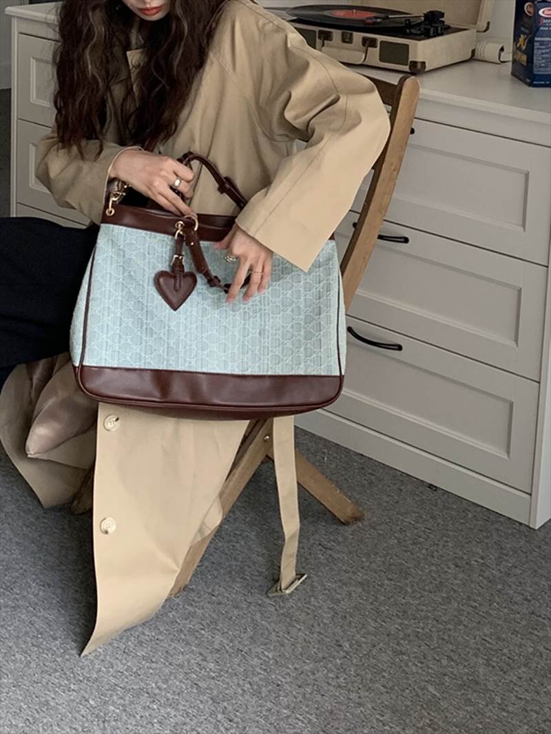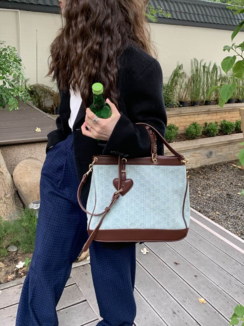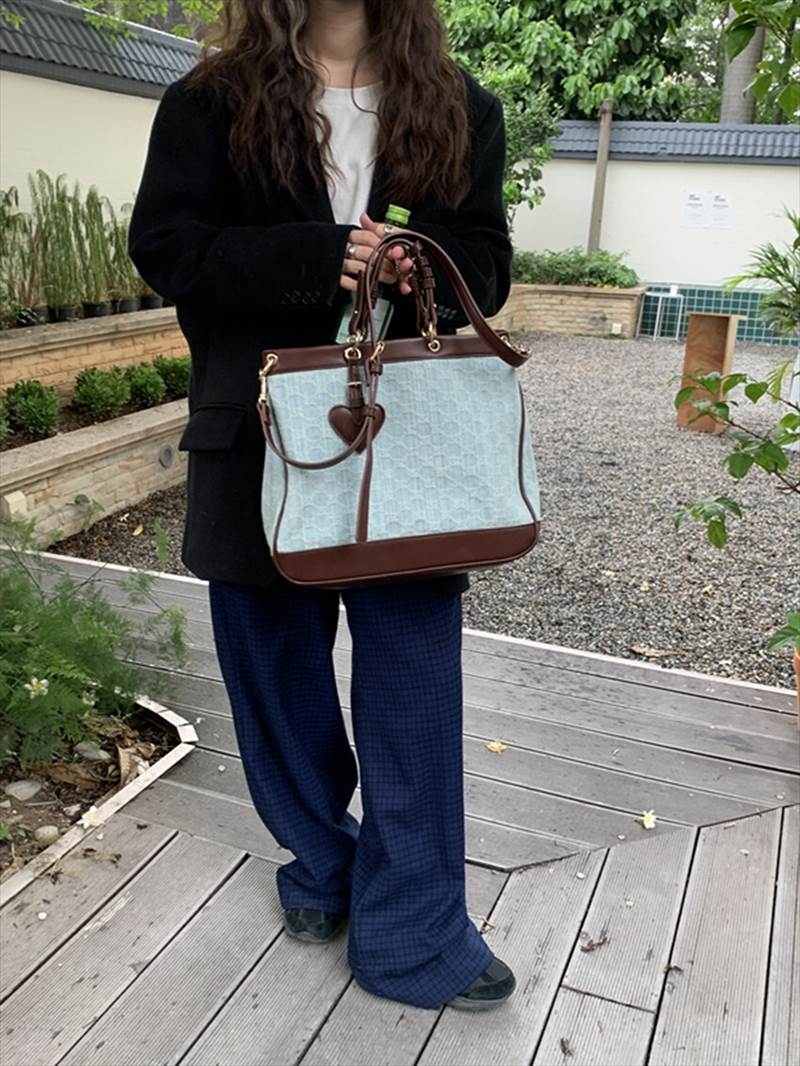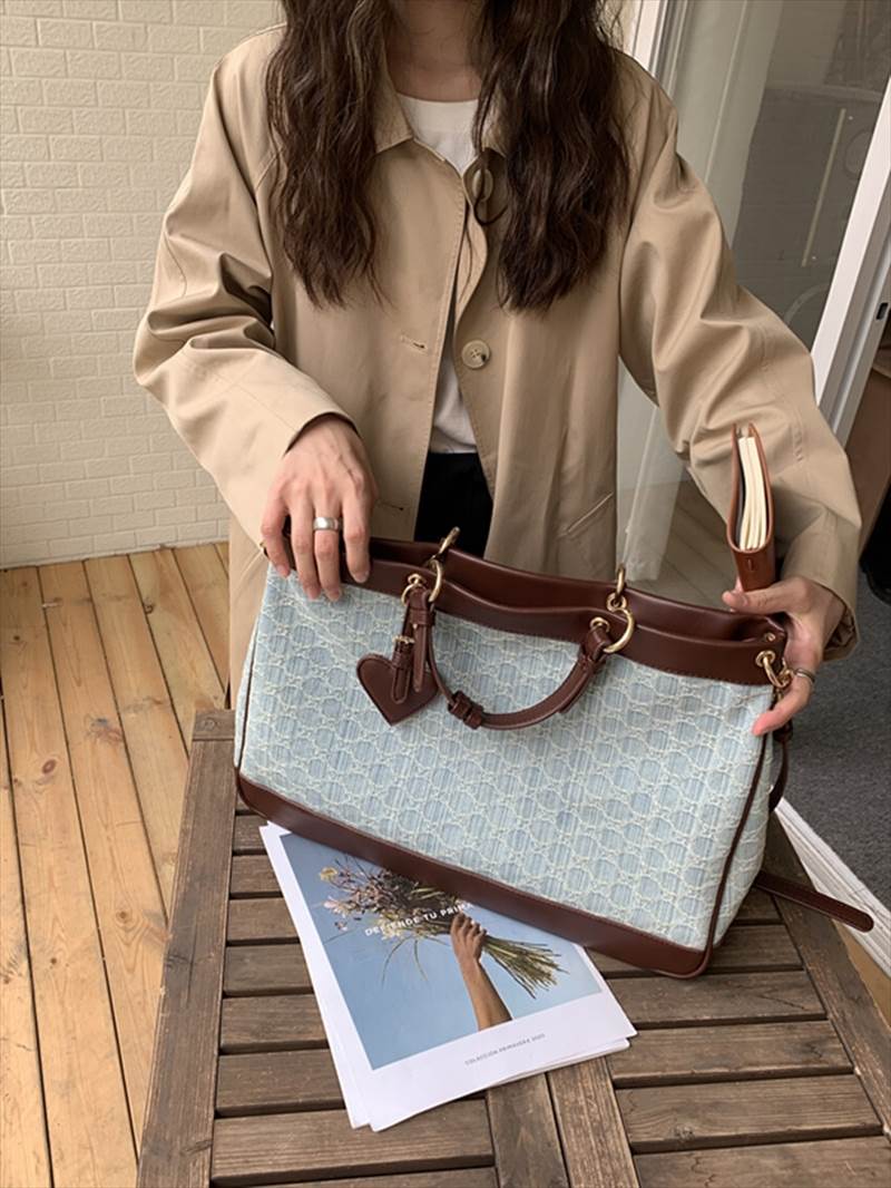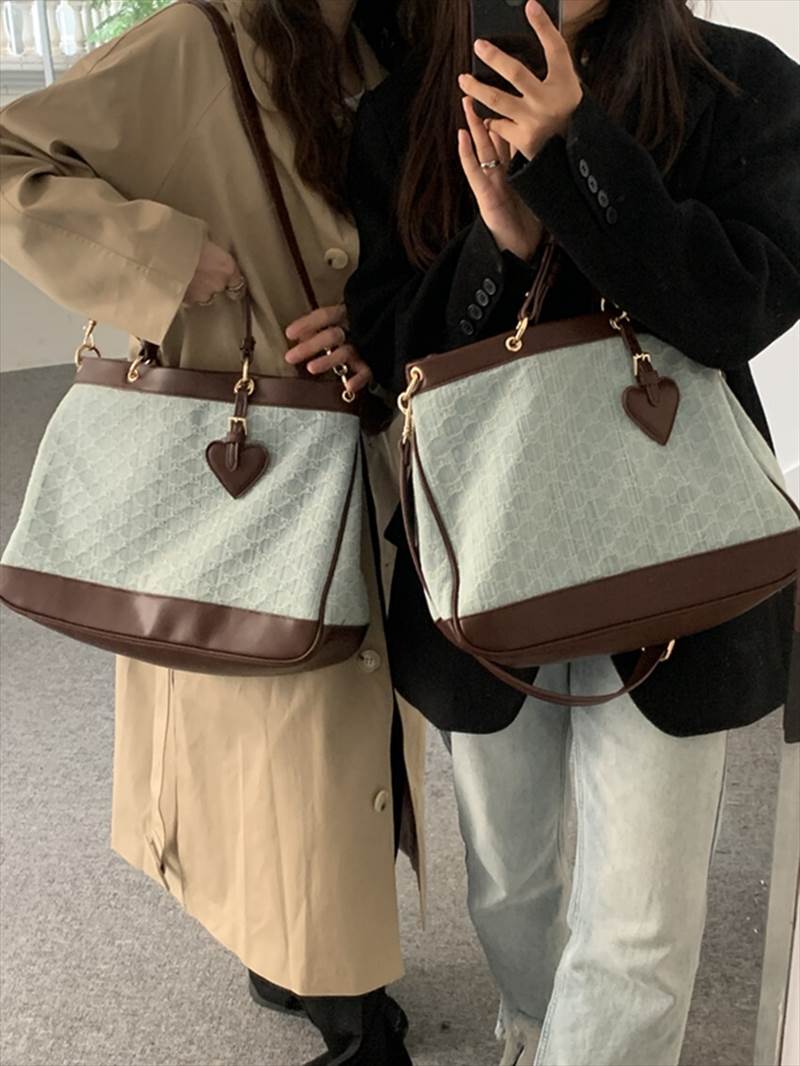 トートバッグ ショルダーバッグ ハート 刺繍 デニム 切り替え 肩掛け 大容量 大きめ PU レザー 革 手提げ 斜めがけ バック カバン 鞄 高見え 通勤 ビジネス 横長 旅行 レトロ バイカ A4