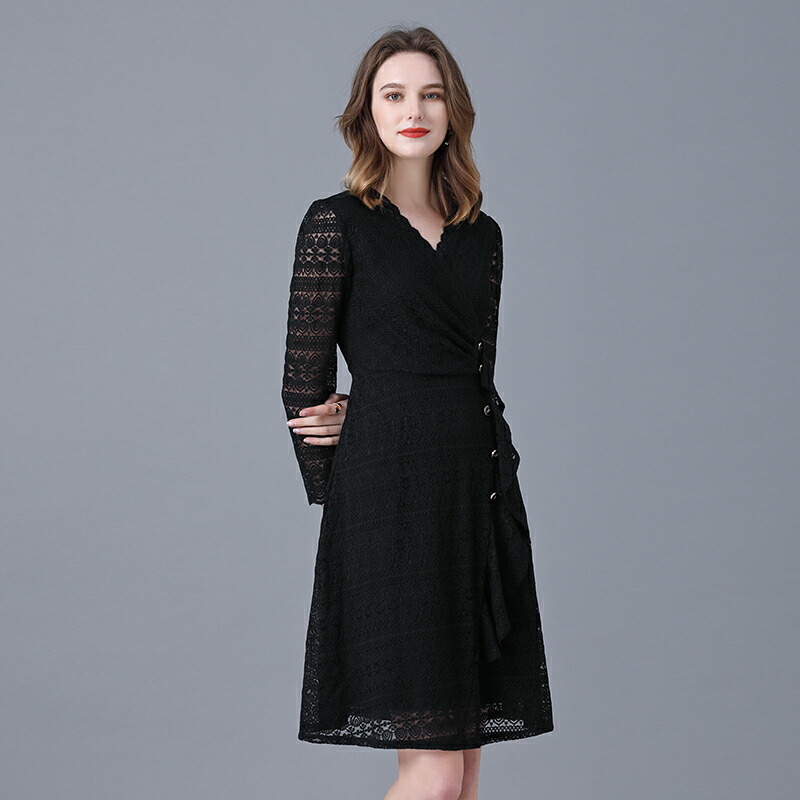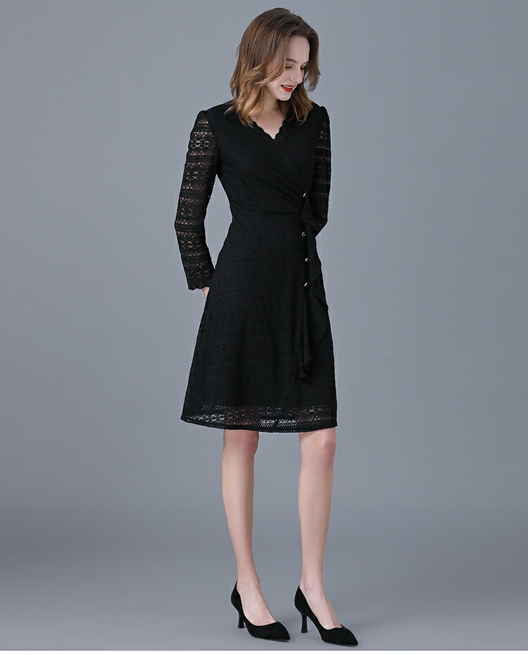 ★クラシカル系おとな優雅上品感ある透け花柄総レース素材のVネック長袖ミディアムフレアドレスワンピースです♪