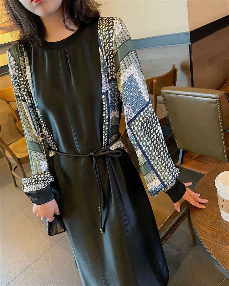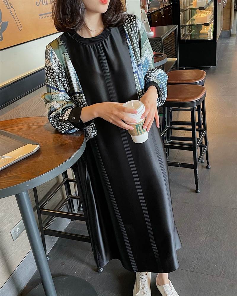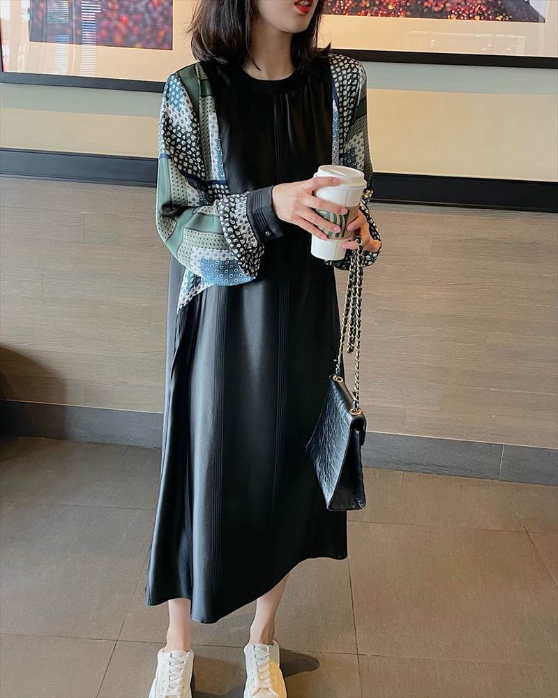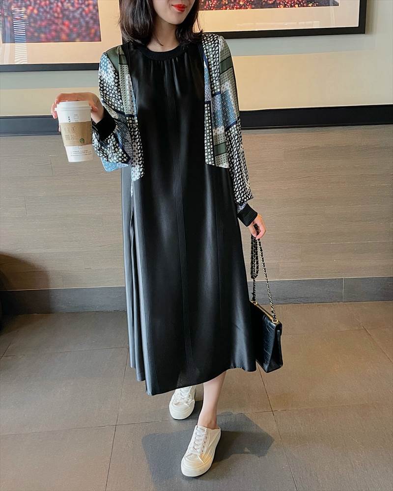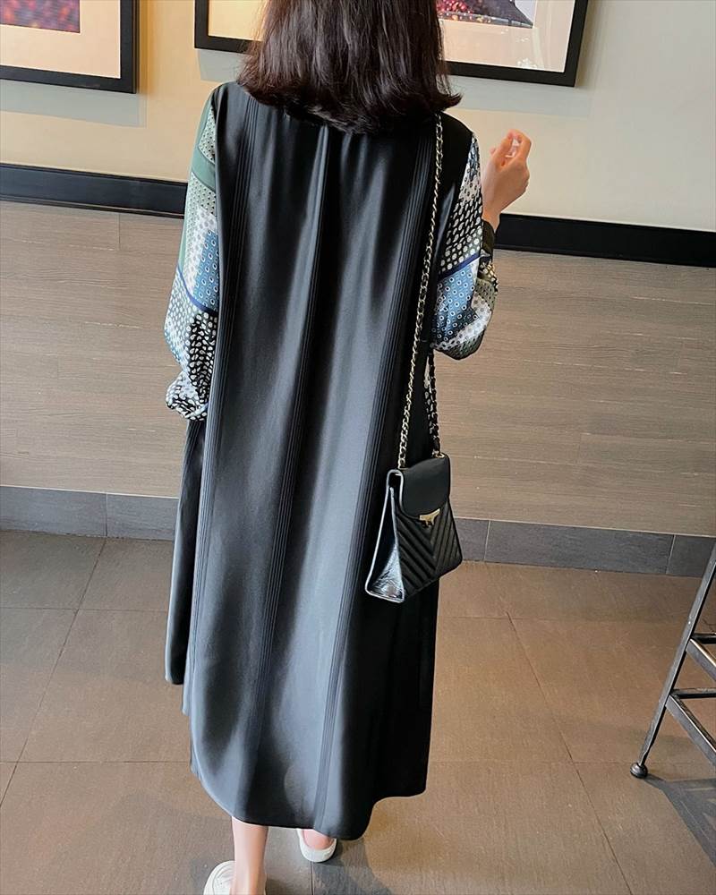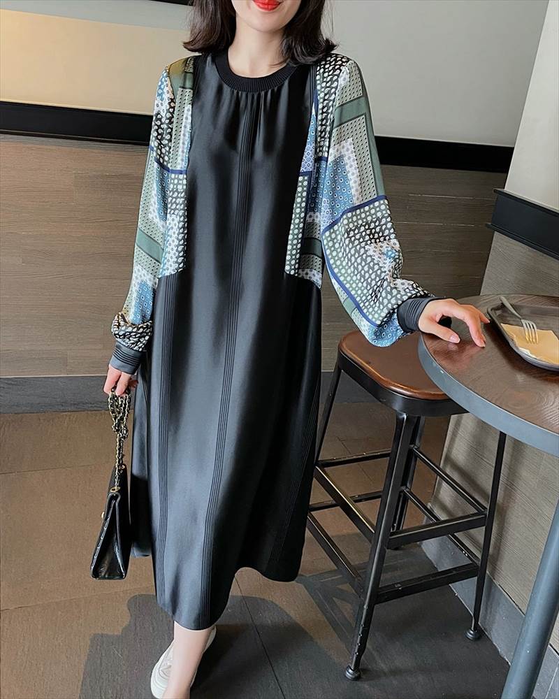 ワンピース レディース ロング丈 ドット 柄 無地 チェック 長袖 襟なし ラウンドネック 切替 フェイクツーピース 大人可愛い かっこいい 黒 ブラック おしゃれ カジュアル 大 レトロ