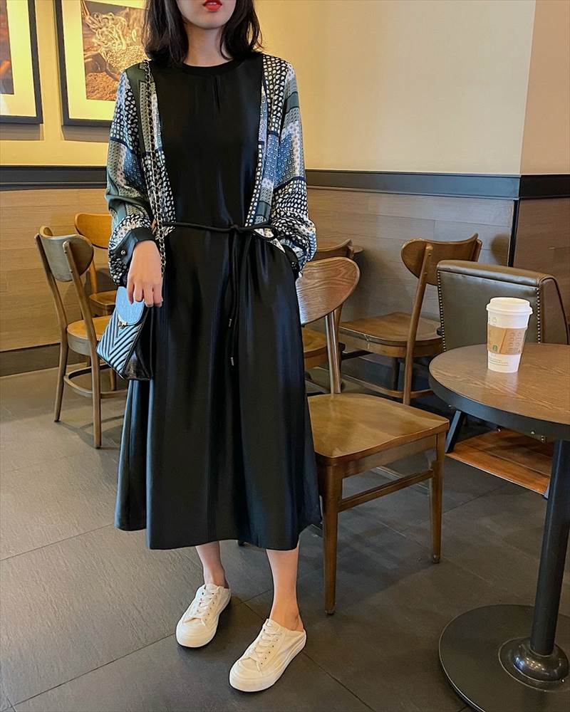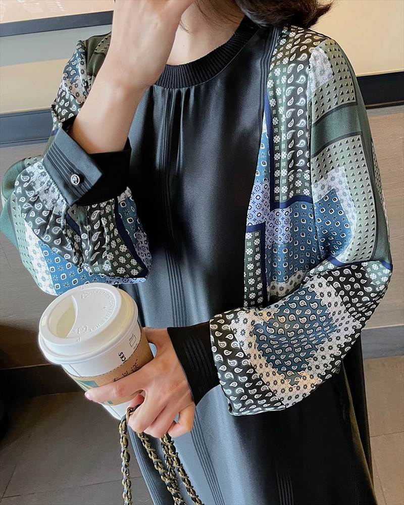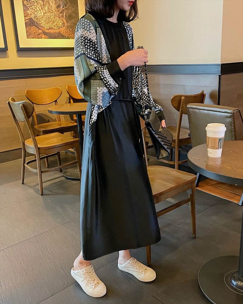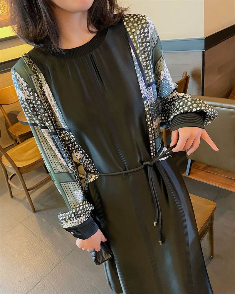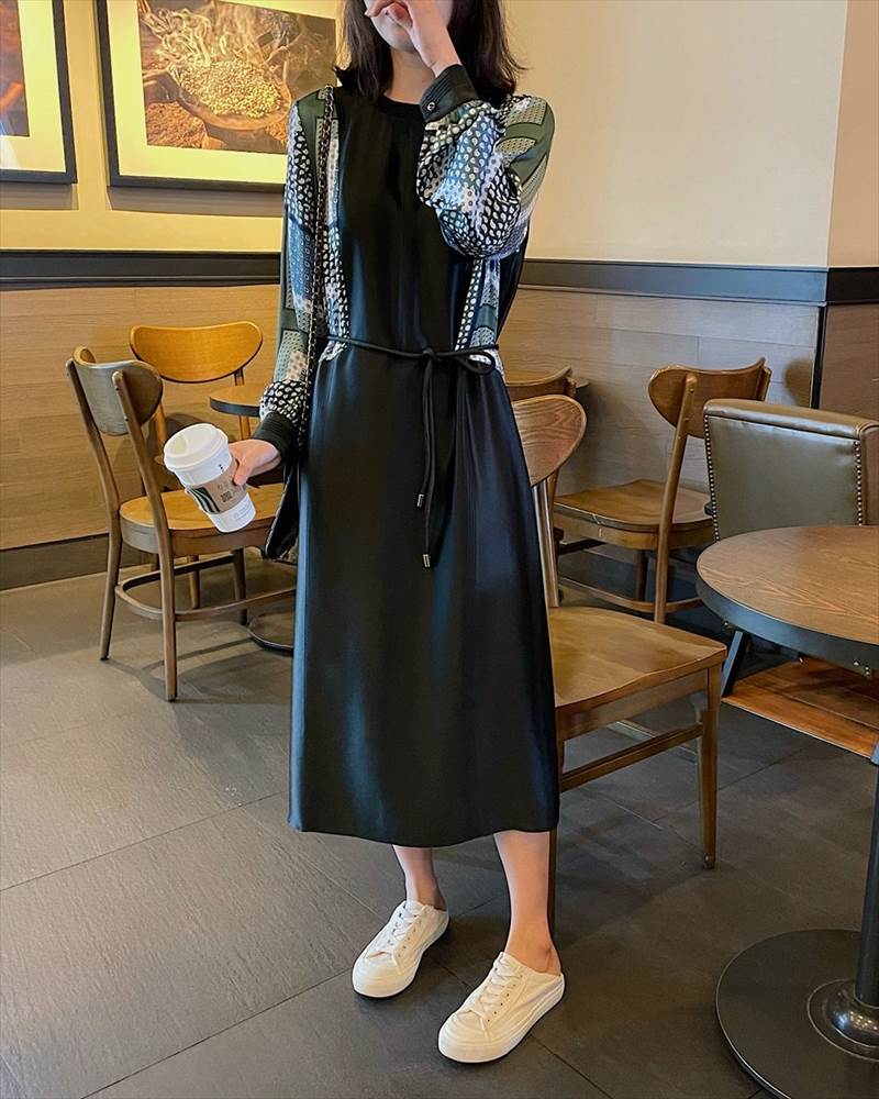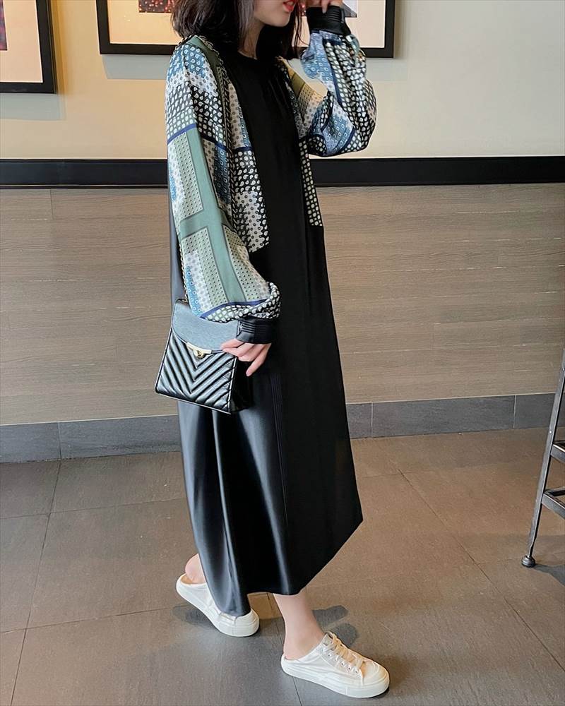 ワンピース レディース ロング丈 ドット 柄 無地 チェック 長袖 襟なし ラウンドネック 切替 フェイクツーピース 大人可愛い かっこいい 黒 ブラック おしゃれ カジュアル 大 レトロ
