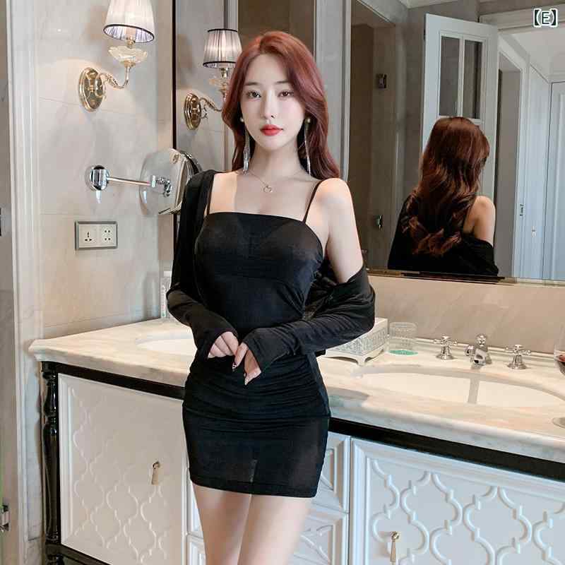 キャバ 魅惑 ドレス レディース 黒 パブ 長袖 レース タイト スカート エレガント プリーツ 韓国 セクシー