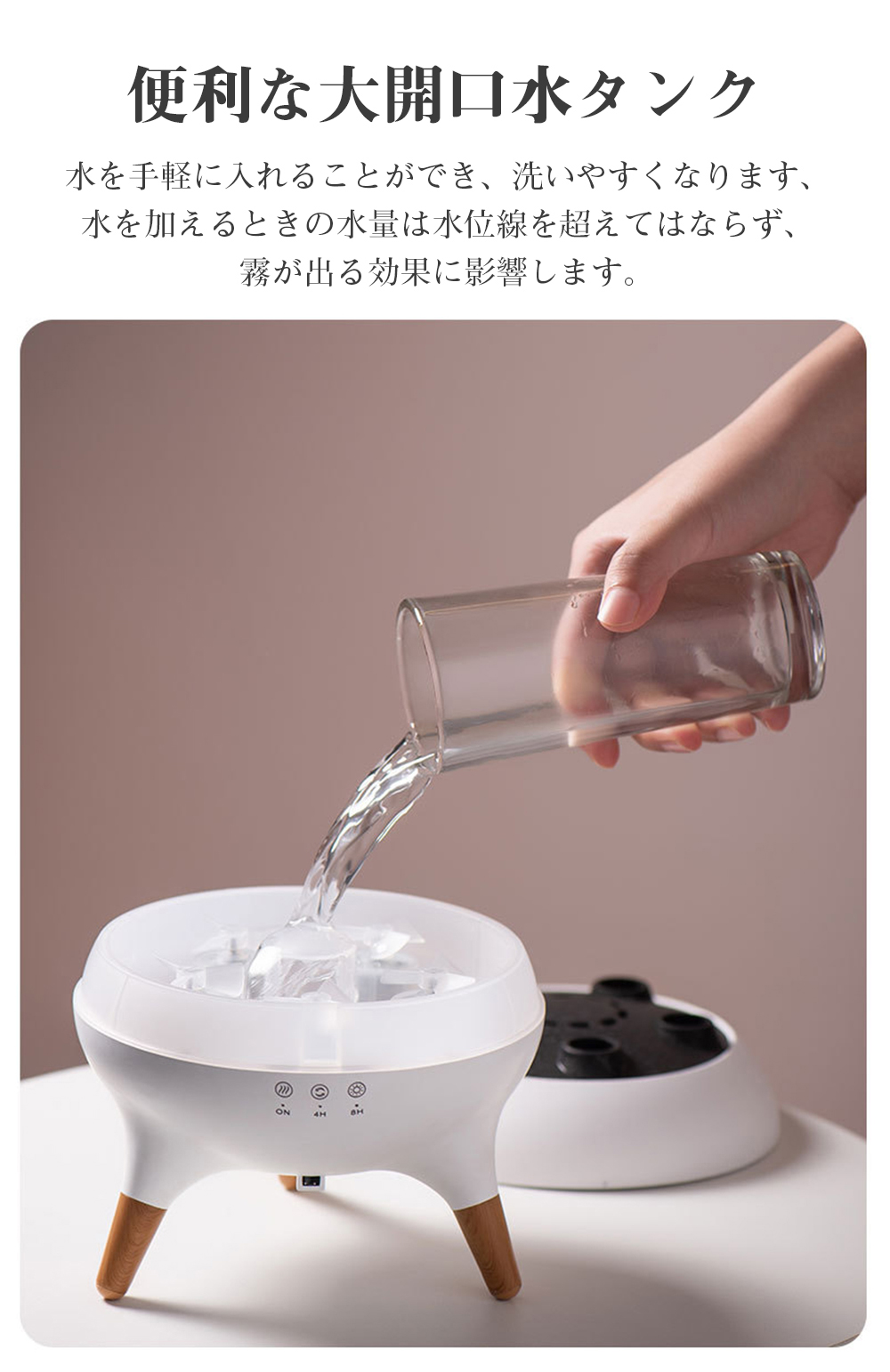 【便利な大開口水タンク】:水を手軽に入れることができ、洗いやすくなります、水を加えるときの水量は水位線を超えてはならず、霧が出る効果に影響します。