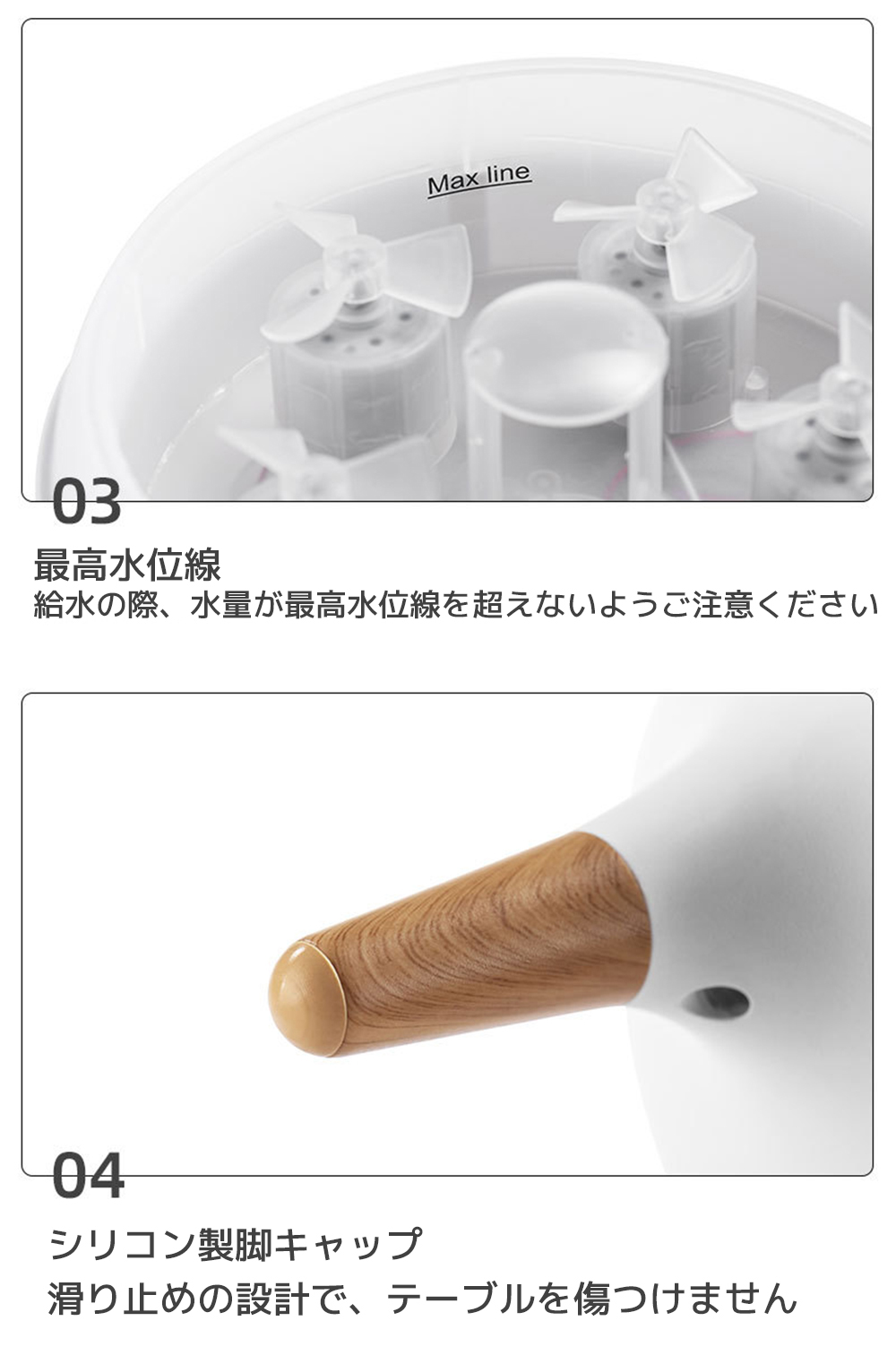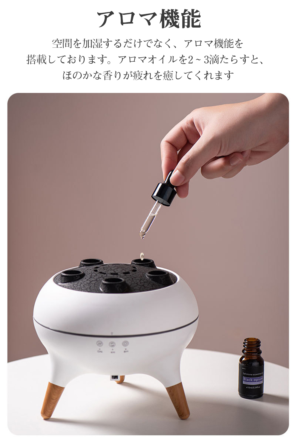 【アロマ機能】:空間を加湿するだけでなく、アロマ機能を搭載しております。アロマオイルを2 ~ 3滴たらすと、ほのかな香りが疲れを癒してくれます