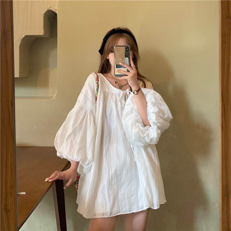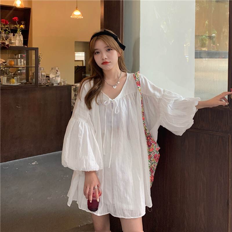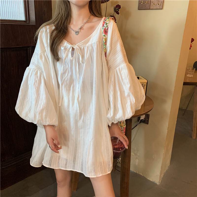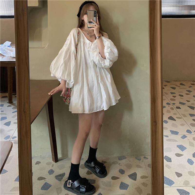 ボリューム袖と大きめVネックがレトロで可愛いシャツワンピースです。