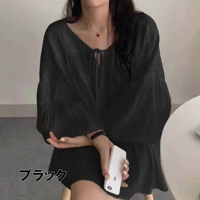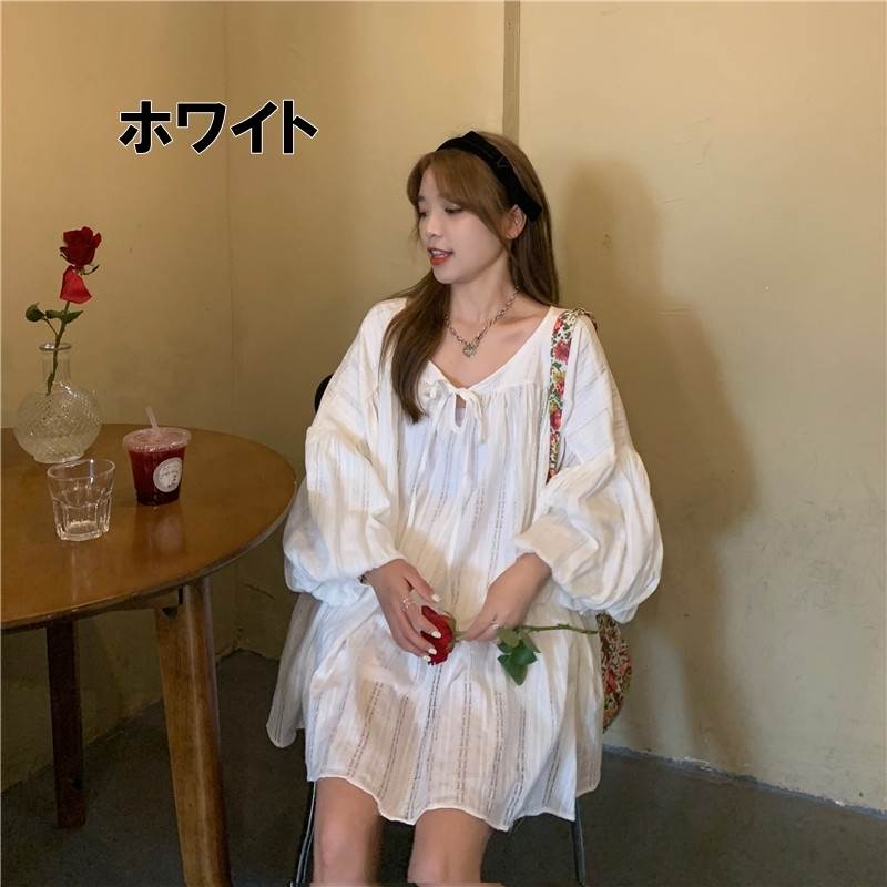 2色 チュニック ギャザー ミニ丈 シャツワンピース レディース 黒 白 ストライプ 春 夏 ジャガード 透け感 シアー シャツワンピ Vネック ランタンスリーブ ブラック ショート丈 ミニ ホワイト