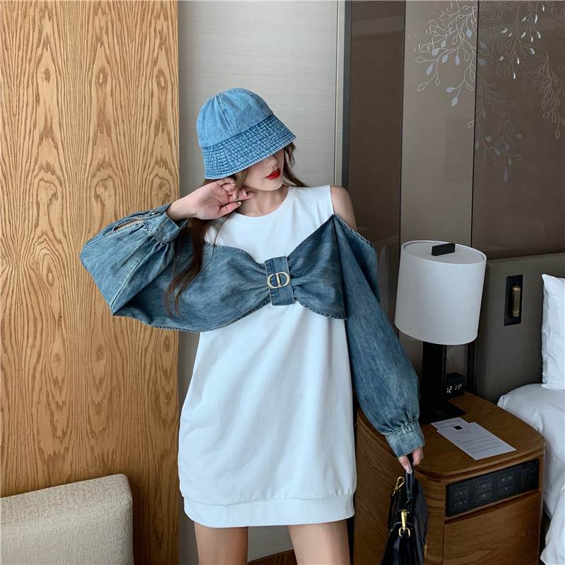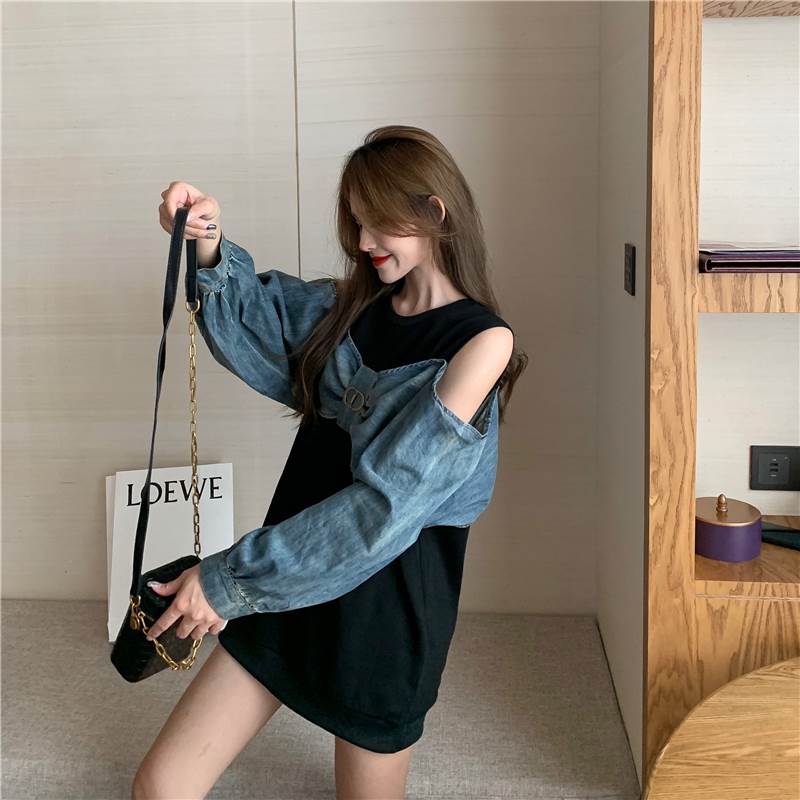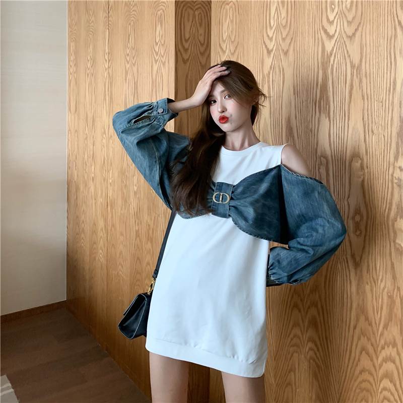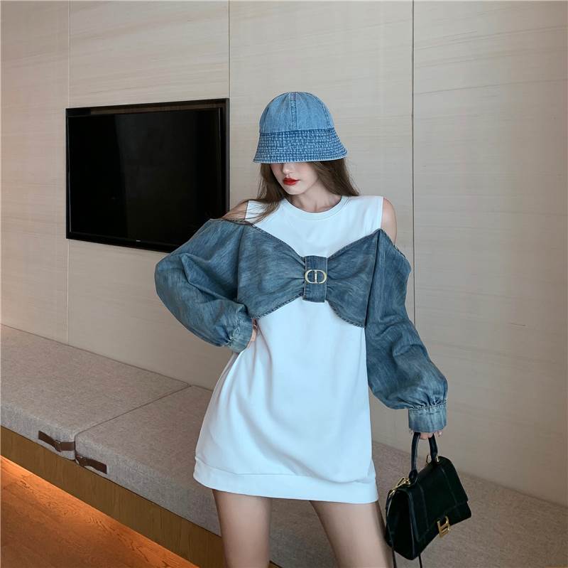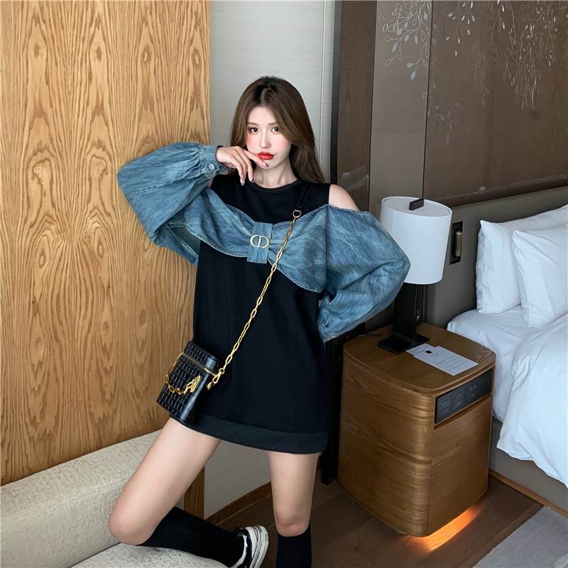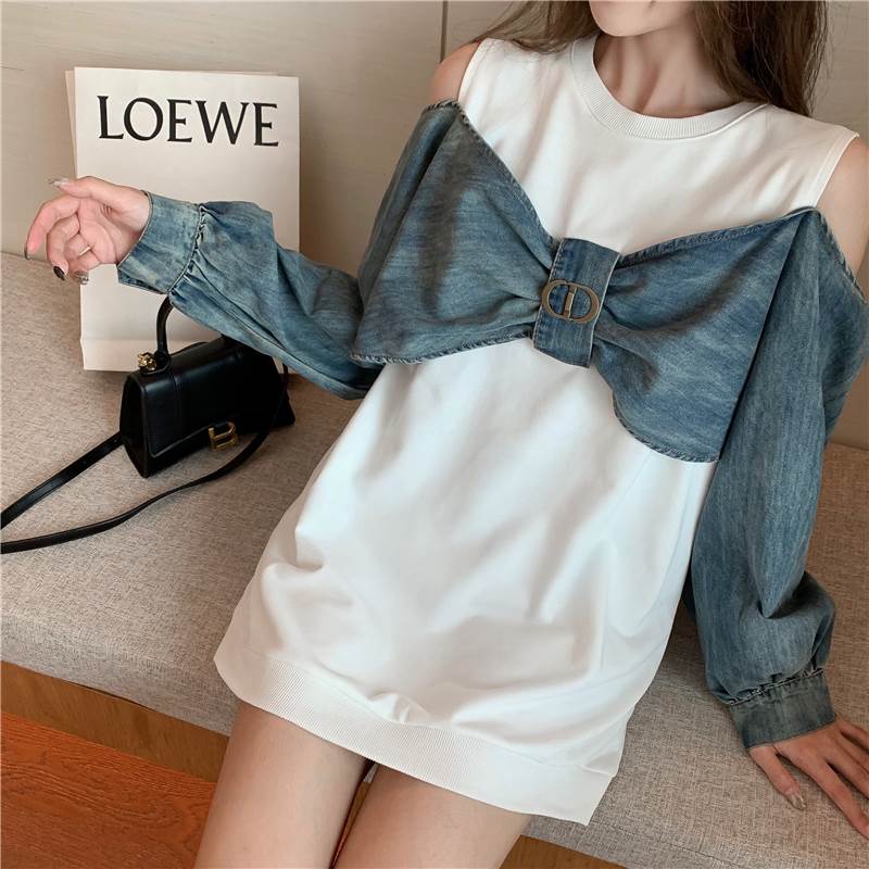 2色 ミニワンピース 長袖 トップス プルオーバー 個性的 デニム 切り替え バイカラー リボン風 肩出し 肌見せ オフショル トレーナーワンピ ポップ スポーティ カジュアル レトロ 可 アクティブ
