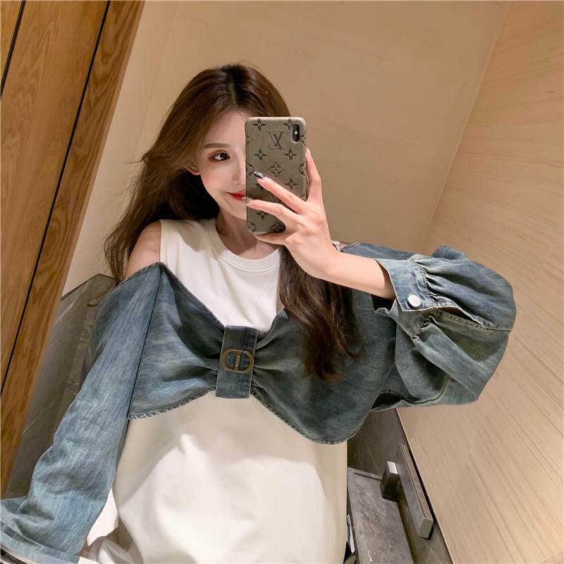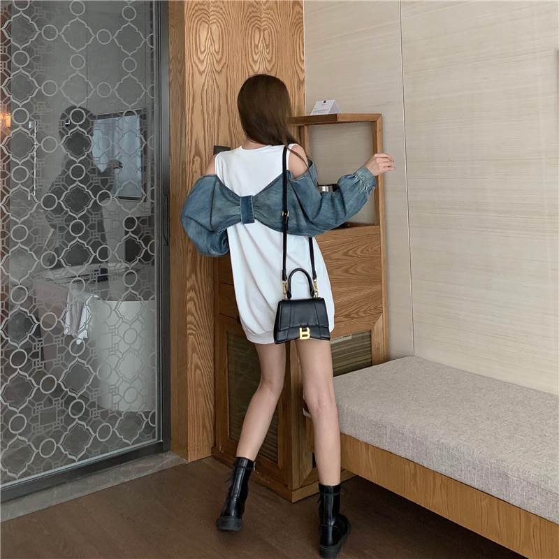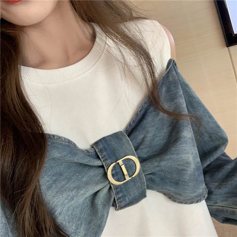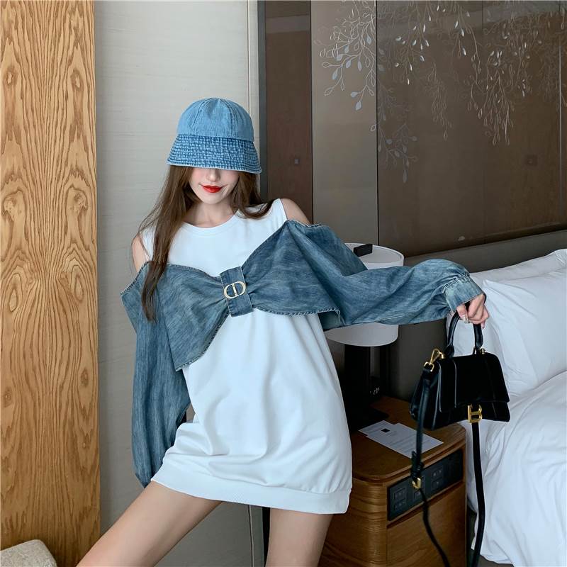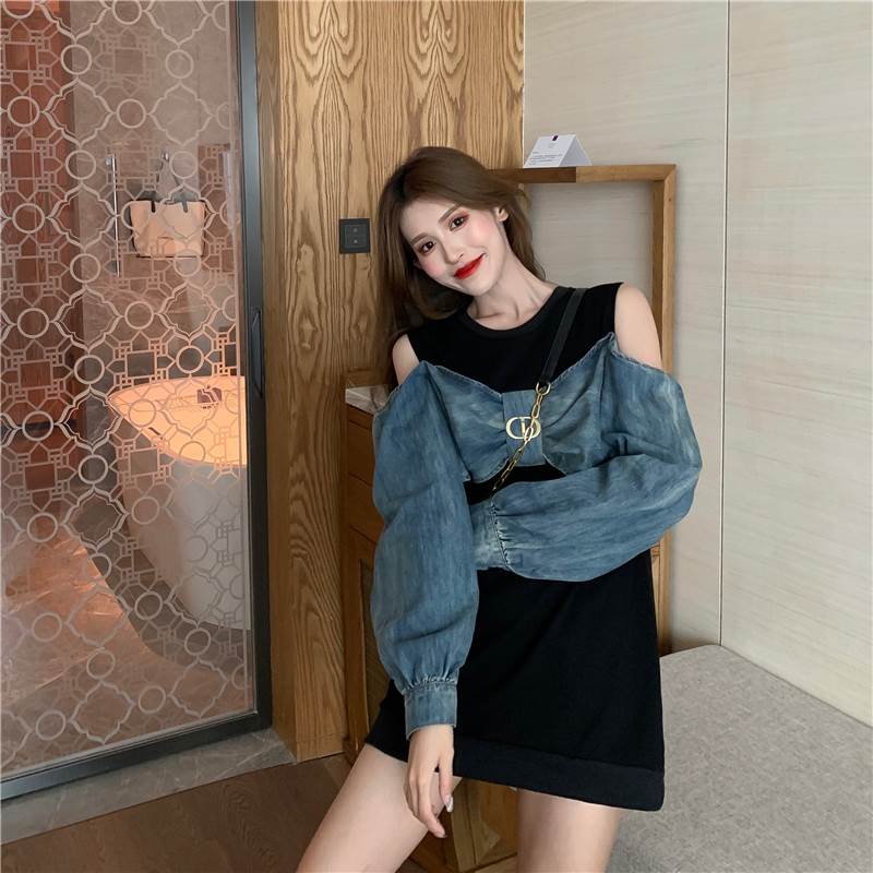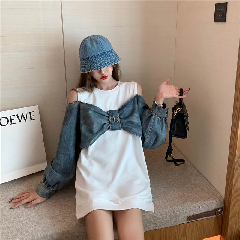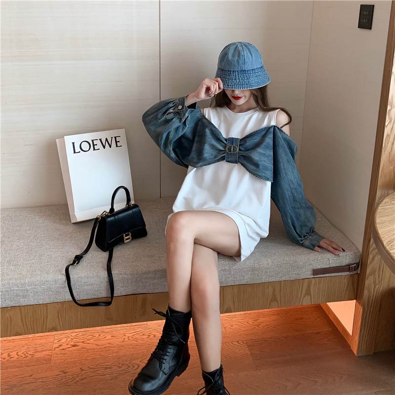 2色 ミニワンピース 長袖 トップス プルオーバー 個性的 デニム 切り替え バイカラー リボン風 肩出し 肌見せ オフショル トレーナーワンピ ポップ スポーティ カジュアル レトロ 可 アクティブ
