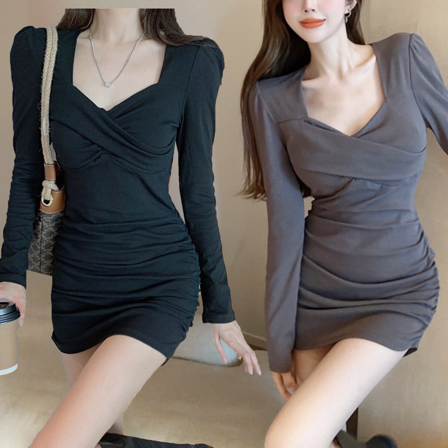 キャバ 魅惑 ドレス レディース 黒 パブ 長袖 レース タイト スカート エレガント プリーツ 韓国 セクシー