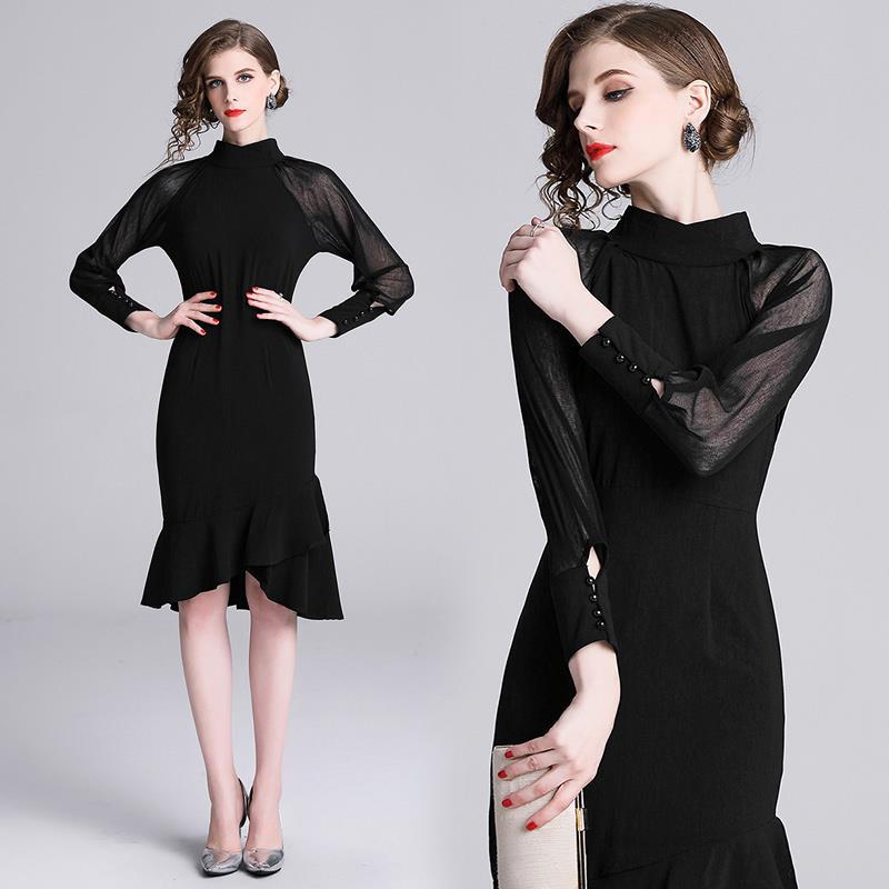 キャバ 魅惑 ドレス レディース 黒 パブ 長袖 レース タイト スカート エレガント プリーツ 韓国 セクシー