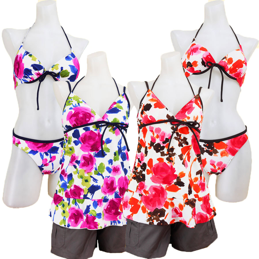Vento Marino 水着 レディース タンキニ ビキニ セパレート 体型カバー ショートパンツ 4点セット かわいい 花柄 カバーアップ タンクトップ サーフパンツ セット 30代 40 パンツ