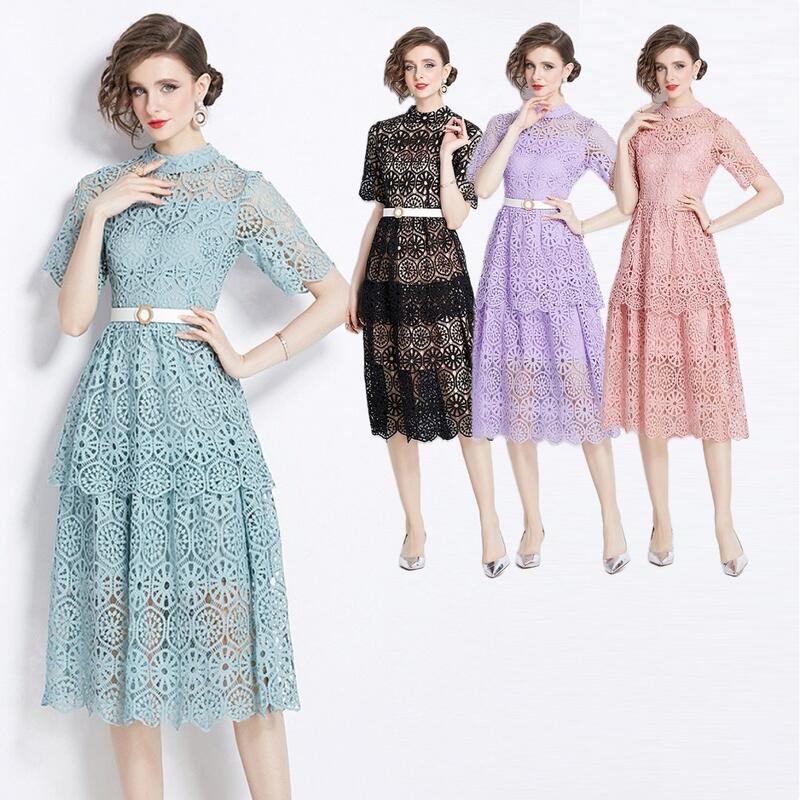 4色クラシカル系 大人優雅 ベルト付き ケミカル総レース 半袖 ミディアムドレスワンピース S M 2L 3L sale L